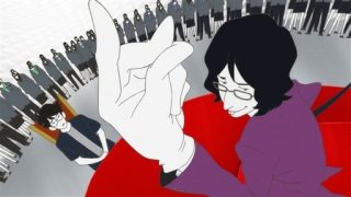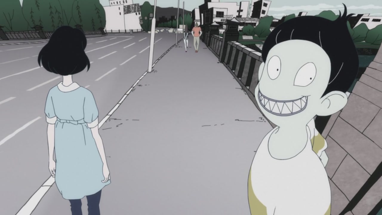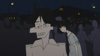 Der spielerische Umgang mit dem Thema spiegelt sich auch in der visuellen Gestaltung wieder. Rosarot soll das Leben des Studenten werden, wenn es nach ihm geht. Zu sehen bekommen wir die Farbe aber selten. Oft ist da sogar überhaupt keine Farbe, und wenn doch, dann ist es irgendwie die falsche: Nichts an The Tatami Galaxy wirkt real, alles ist schief, verzerrt, die Perspektiven, die Hintergründe. Nicht einmal die Figuren sehen immer normal aus, Ozu wird hier zum einem dämonengleichen Unglücksbringer. Masaaki Yuasa, der schon in Mind Game ein experimentelles Feuerwerk losgelassen hat und sich hier mit dem Traditionshaus Madhouse (The Irregular at Magic High School, Record of Lodoss War) zusammengetan hat, lässt sich erneut nicht auf eine bestimmte Optik festlegen, kombiniert verschiedene Stile, wo es nur geht, baut auch schon mal (verfremdete) Realaufnahmen ein.