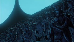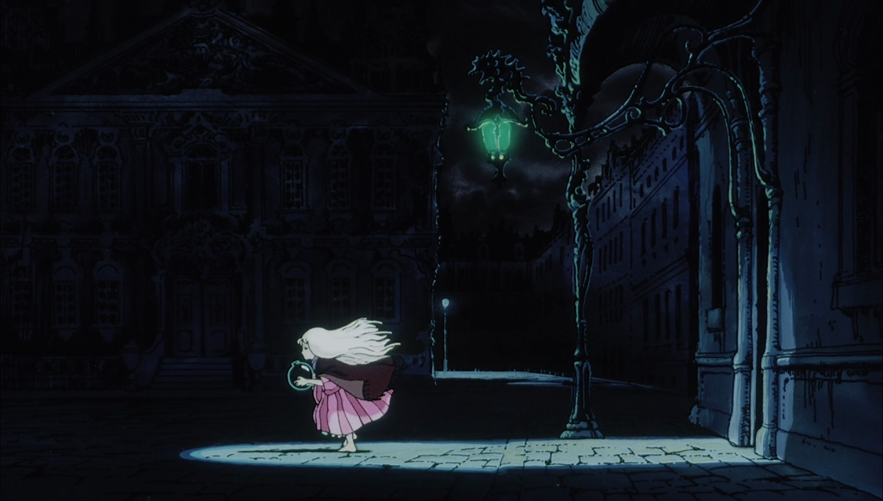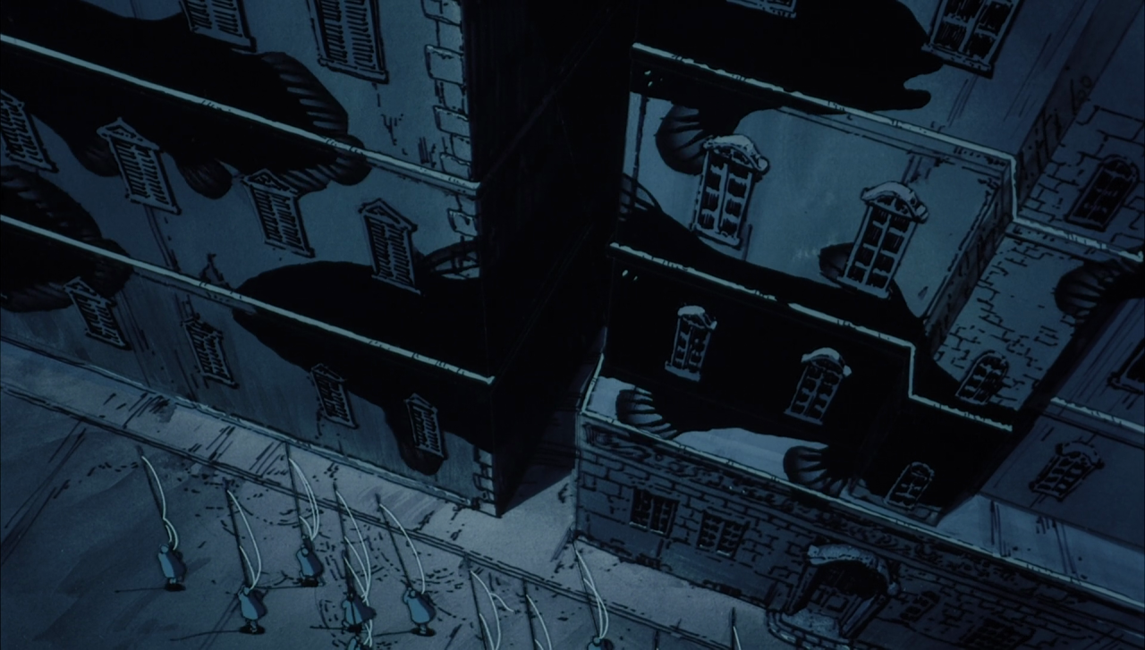Das macht Angel’s Egg mindestens zu einer Herausforderung, für viele sogar zu einer Zumutung. Umso mehr, da hier kaum etwas geschieht. Wo andere surreale Zeichentrickfilme wie eben Der phantastische Planet, Cat Soup oder Gwen et le livre de sable bei aller Rätselhaftigkeit doch zumindest eine erkennbare Entwicklung haben, ist man hier in einer Zeitblase gefangen. Dass der Film dennoch so sehenswert ist, bei vielen älteren Anime-Zuschauern sogar absoluter Kult, das liegt nicht nur an dem seltsamen „was“, sondern auch an dem ebenso fremdartigen „wie“. Gemeinsam mit Yoshitaka Amano, der als Illustrator der frühen „Final Fantasy“-Spiele bekannt ist, aber auch bei diversen Animes mitgewirkt hat (Vampire Hunter D, Ayakashi: Samurai Horror Tales), schuf er eine Welt, die gleichzeitig vertraut ist und doch ihresgleichen sucht. Düster ist sie, von gelegentlichen Rottönen abgesehen ein Schatten aus Blau und Schwarz. Niemand scheint mehr in der Stadt zu leben, auch wenn die Straßenlaternen und Brunnen nach wie vor funktionieren. Die Gebäude sind verlassen, größtenteils zu Ruinen verfallen.