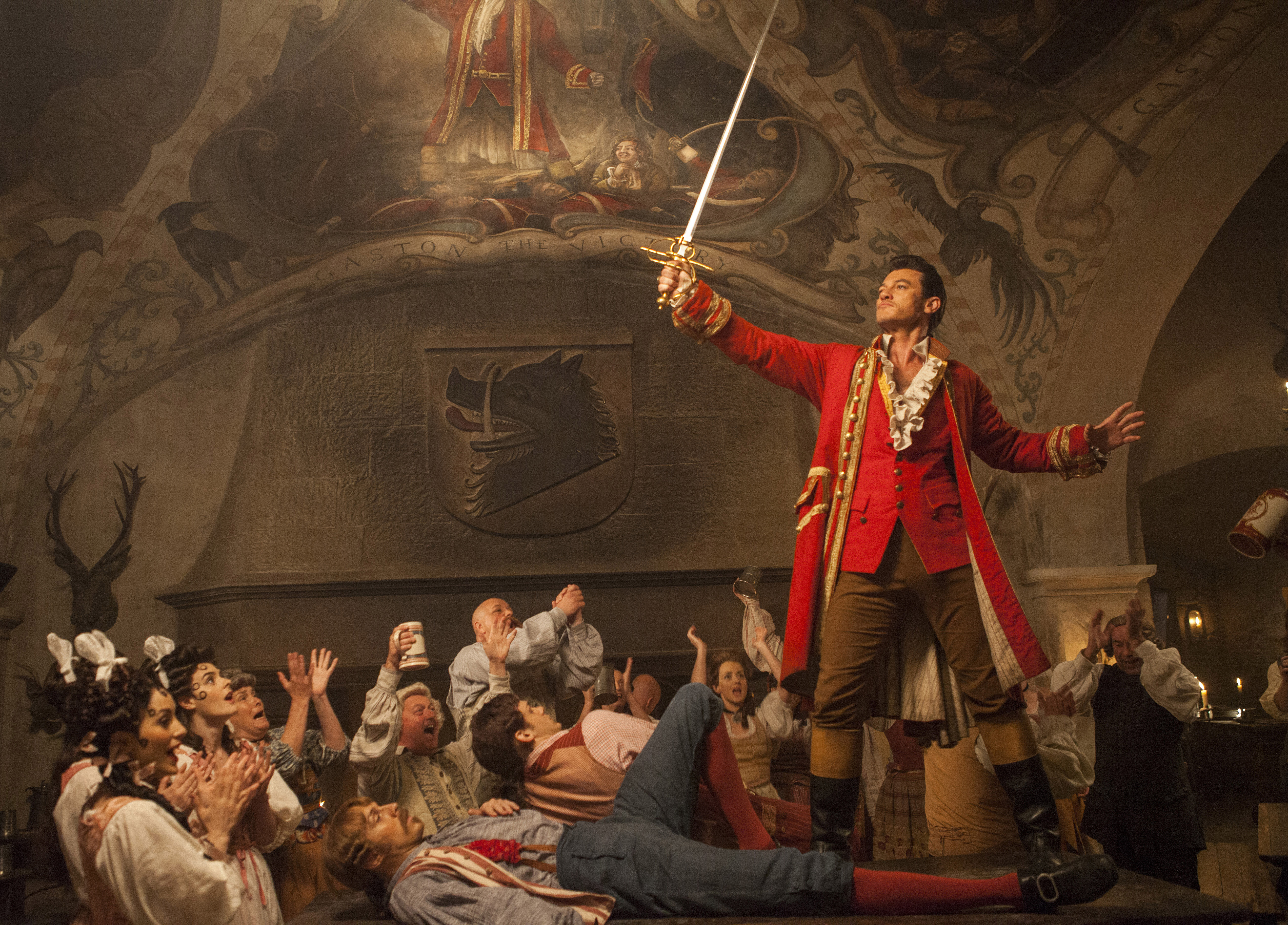 Auch bei der Besetzung trifft Licht auf Schatten. In den meisten Fällen zeigte Disney wie auch schon bei den vorangegangenen Realadaptionen ein glückliches Händchen. Oder auch ein Öhrchen. Sofern man sich damit abfinden kann, dass in der französischen Provinz plötzlich zum Großteil Briten herumlaufen, erwartet einen in der englischen Originalversion allerhand Schauspielprominenz. Das betrifft zum einen das verzauberte Hauspersonal, welches unter anderem von Ewan McGregor, Ian McKellen und Emma Thompson gesprochen wird. Letztere hat auch die (un-)dankbare Aufgabe, mit dem Titellied eines der berühmtesten Disney-Stücke aller Zeiten interpretieren zu dürfen. Dabei schlägt sie sich achtbar, wenngleich ihrer Version die knorrige Wärme einer Angela Lansbury fehlt. Josh Gad, der mit LeFou die medienwirksam ausgeschlachtete erste homosexuelle Figur im Mäusemärchenreich verkörpert, ist eine zumindest witzige Nebenfigur. Ein Comic Relief inmitten der Tragik und Romantik. Noch unterhaltsamer ist nur noch Luke Evans, der sonst meist im Genrekino auftritt (zuletzt in Girl on the Train und High-Rise), hier aber als eitler Gaston vielleicht die Rolle seines Lebens spielt und seine lange Bühnenerfahrung sowie das beachtliche Sangestalent an den Mann bringt. Vor allem aber an die Frau.
