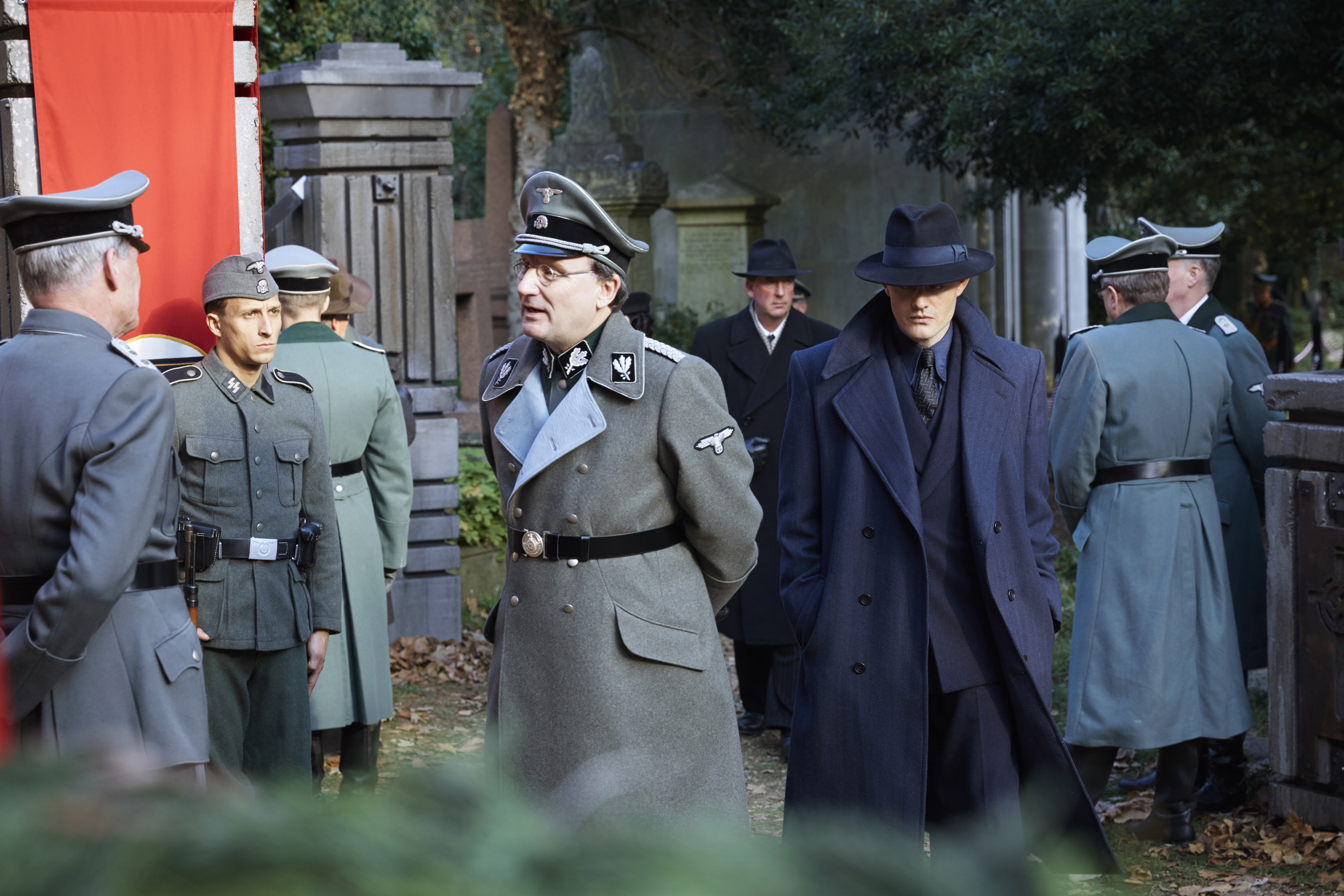 Gleichzeitig ist SS-GB aber eben auch eine Spionageserie. Da wird kräftig intrigiert, Leute führen ein Doppelleben. Selbst innerhalb derselben Seite sind nicht alle auf derselben Seite – Machtkämpfe innerhalb der deutschen Besatzer gehören zum Spiel ebenso dazu wie geheime Pläne des Widerstandes oder auch der offiziell neutralen Amerikaner. Es ist recht spannend, was Regisseur Philipp Kadelbach (Unsere Mütter, unsere Väter, Auf kurze Distanz) aus dem betagten Stoff geholt hat. Die Aufklärung des anfänglichen Mordfalls fesselt ebenso wie die persönlichen Schicksale. Dass Archer sich irgendwann für die „richtige“ Seite entscheiden wird, steht zwar außer Frage, dafür wird er zu sehr von Anfang an als Protagonist gepusht. Ansonsten ist aber offen, was hier wann wie und wem geschehen wird – schließlich befinden wir uns in einer alternativen Realität.