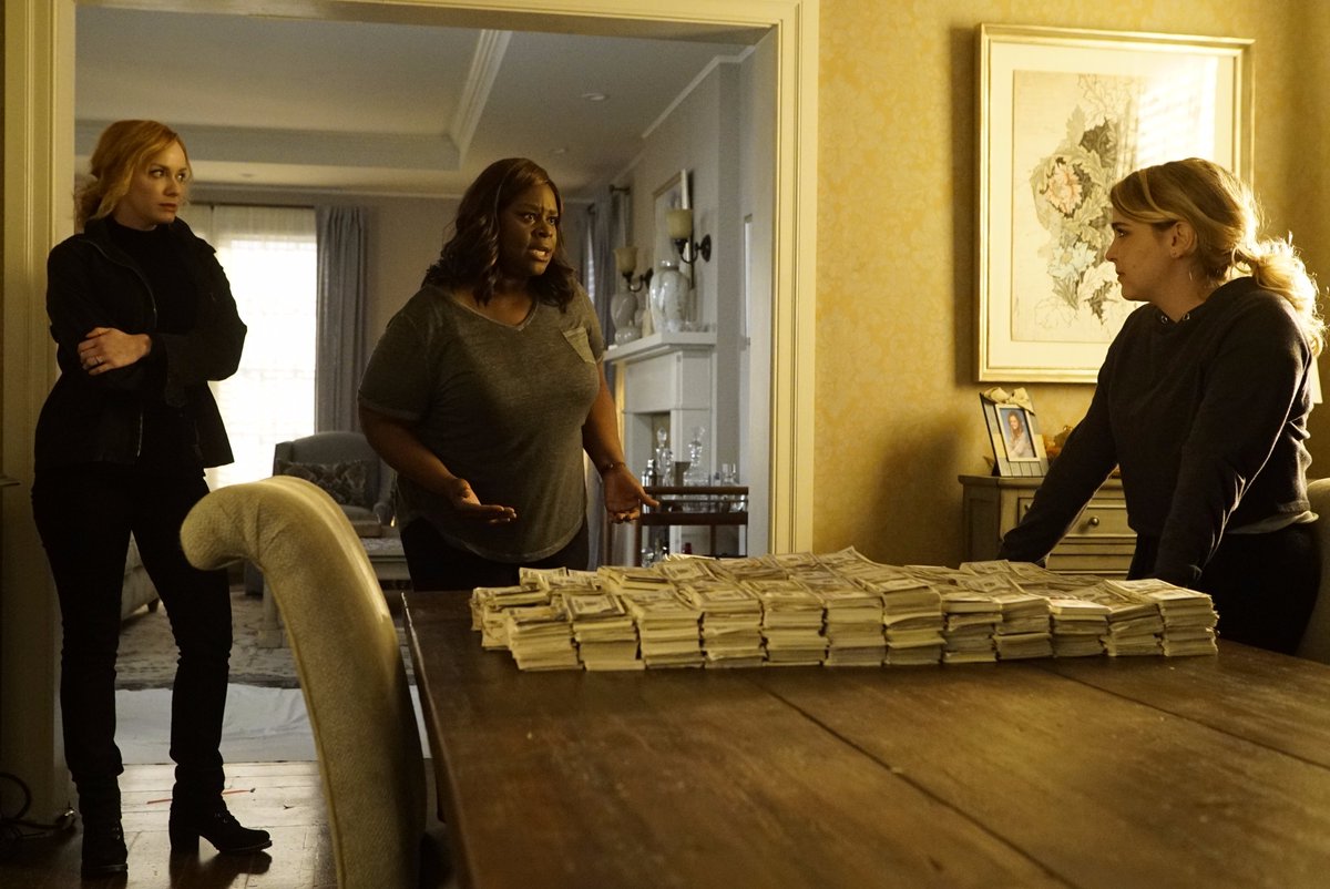 Der Vergleich zwischen dem Hollywoodstreifen und der Netflix-Serie hinkt aber natürlich. Wo die Meisterdiebinnen ihren räuberischen Tätigkeiten aus Berufung nachgehen, da ist das hier aus der Not geboren. Der feministische Mehrwert hält sich dadurch ein bisschen in Grenzen, trotz der Unabhängigkeitsbemühungen der drei. Dafür sind sie letztendlich auch zu inkompetent. Verständlich: Wessen Alltag sonst darin besteht, Kinder von der Schule zu holen, den Haushalts zu schmeißen oder in unbedeutenden Diners zu servieren, dem fehlt es an Erfahrung, wenn statt eines Kochlöffels nun eine Waffe in der Hand steckt.