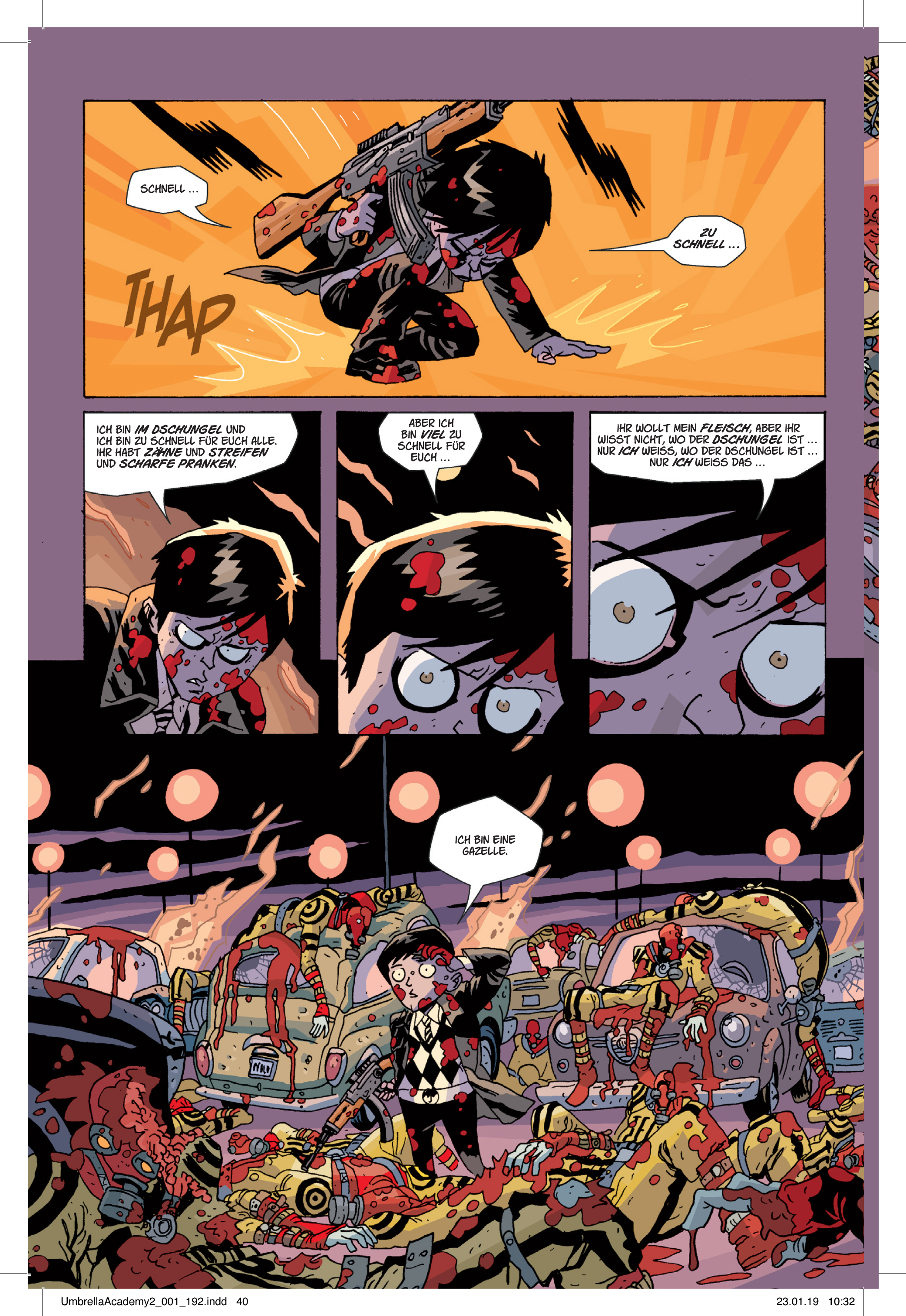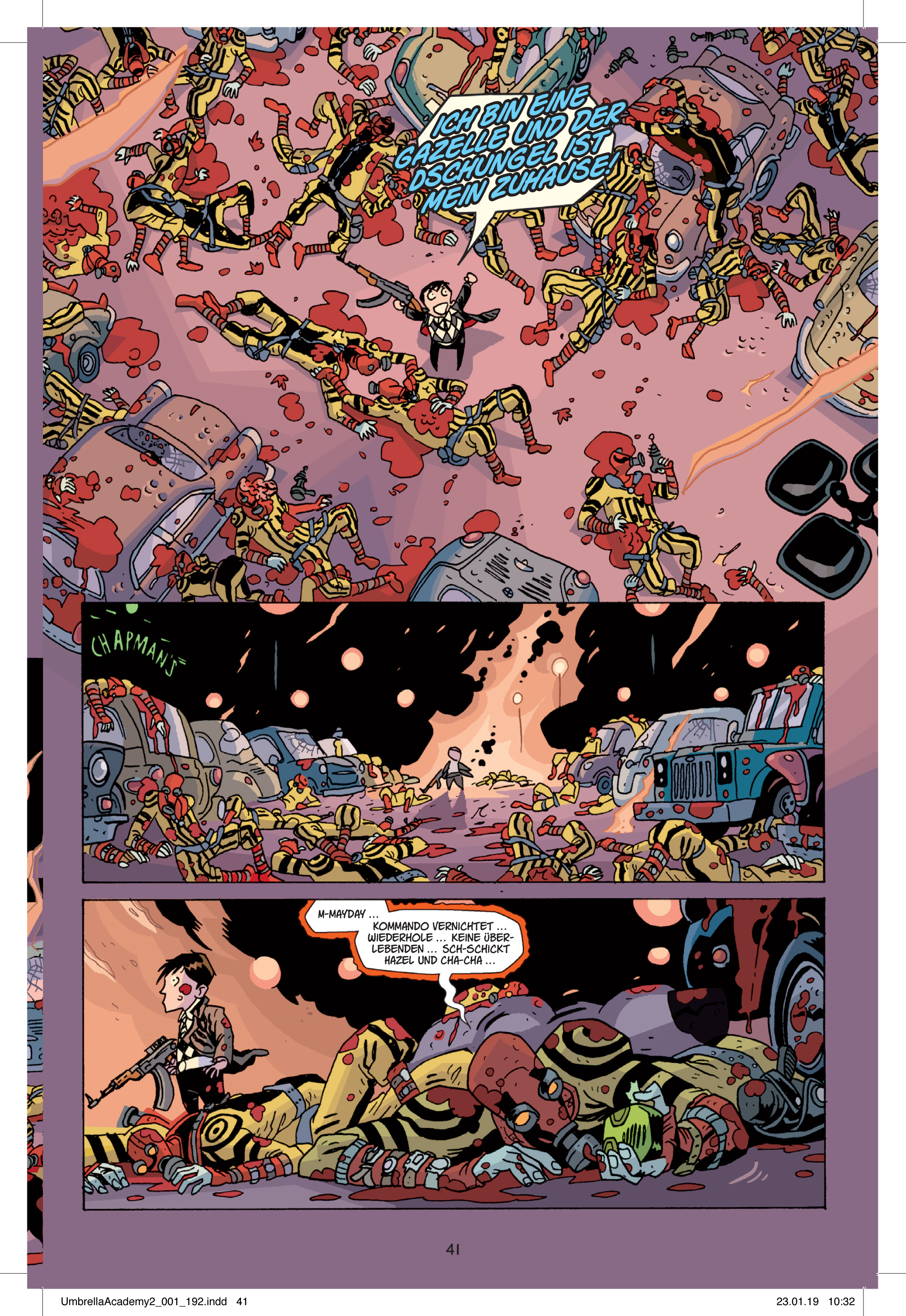 Wer die Netflix-Adaption The Umbrella Academy gesehen hat, für den wird die Geschichte nicht mehr ganz so neu sein. Schließlich griff sich die erste Staffel der Serie beide Bände der Comic-Reihe und führte deren Plots zusammen. Aber selbst erfahrene Zuschauer und Zuschauerinnen können deshalb hier einmal hineinlesen. Zum einen weicht die Umsetzung teils doch recht deutlich vom Original ab, hat beispielsweise ein komplett anderes Ende. Zum anderen sind die Figuren der zeitreisenden Auftragsmörder Hazel und Cha-Cha so kurios, dass man ihnen gerne noch ein zweites Mal begegnet. Aus sicherer Entfernung, versteht sich.