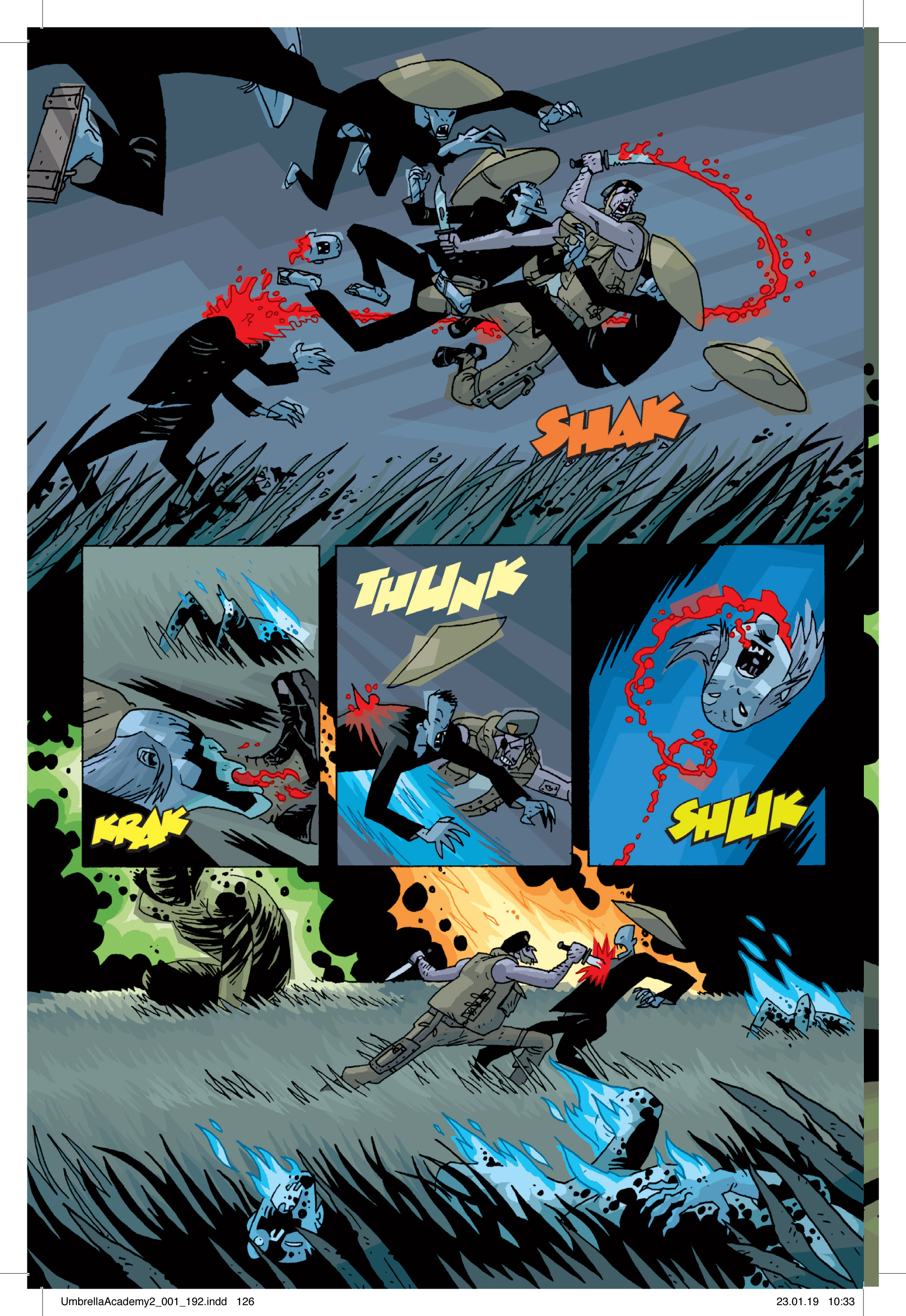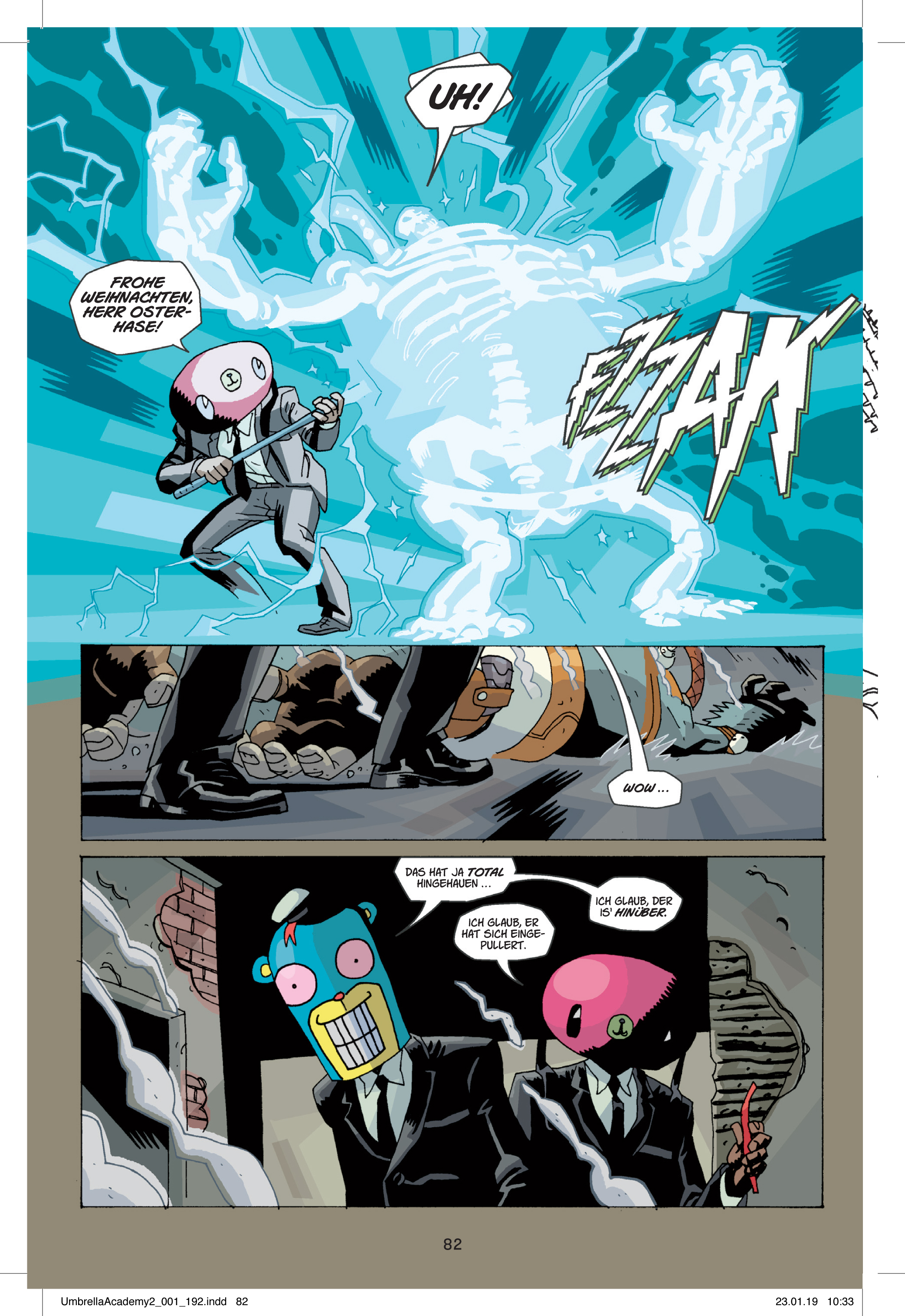 Aber auch visuell geht der Comic ganz eigene Wege. Die Designs der Figuren sind sehr markant, mit vielen Ecken und Kanten. Gleichzeitig verschwinden die Gesichtszüge gerne einmal im Nichts. Wirklich viele Details haben die Zeichnungen meistens ohnehin nicht, die Bilder gleichen oft mehr rudimentären Skizzen. Dafür geschieht in den Kämpfen so viel, dass man schnell die Übersicht verliert. Auffallend ist zudem der Hang zum Ton in Ton: Große Kontraste bei den Farben sind selten. Allgemein ist The Umbrella Academy: Dallas nicht gerade bunt, optisch ist das nicht annähernd so grell wie der Inhalt.