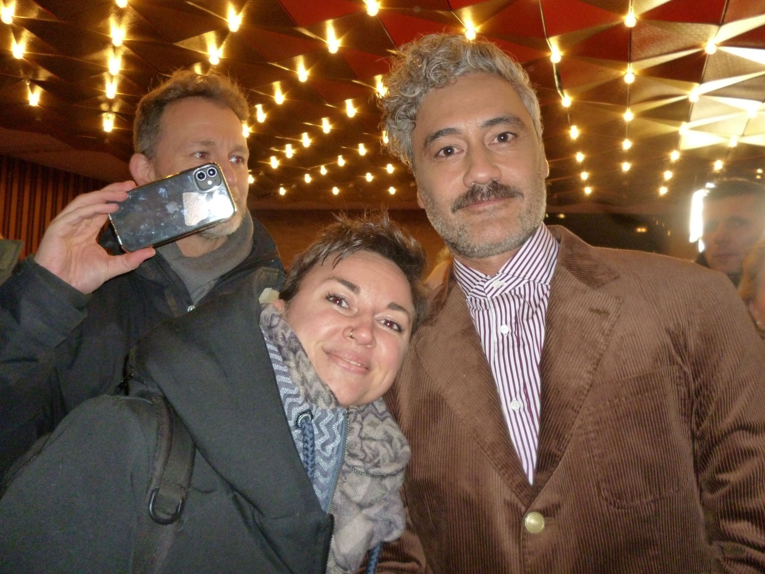 Dann kurzer Moment der Stille und Waititi persönlich erscheint. Trotz lautem Rufens scheint keine Zeit für die Fans am roten Teppich, obwohl er mit seinen Agenten spricht und signalisiert, er will nach dem Foto Call nochmal rauskommen. Leider wird daraus nichts. Umso erfreulicher aber, dass ein Augenblick im Foyer des Kinos bleibt, in dem er wirklich geduldig, trotz der wie üblich chaotischen Zustände, Fotos macht und Autogramme schreibt, bevor es dann zur kurzen Bühnenpräsentation geht. Unter lautem Applaus werden der Regisseur und Produzent Carthew Neal begrüßt, die sich schon jetzt zu Scherzen aufgelegt zeigen. Taika meint fröhlich: „We’ll be back afterwards for a Q&A. In case you guys didn’t understand anything…We’ll explain it to you“. Die gute Laune steckt an und bringt das Publikum direkt auf die richtige Stimmung für den anschließenden Film. Und an dem haben die Gäste hörbar ihre Freude. Jojo Rabbit ist also an dem Abend ein voller Erfolg.