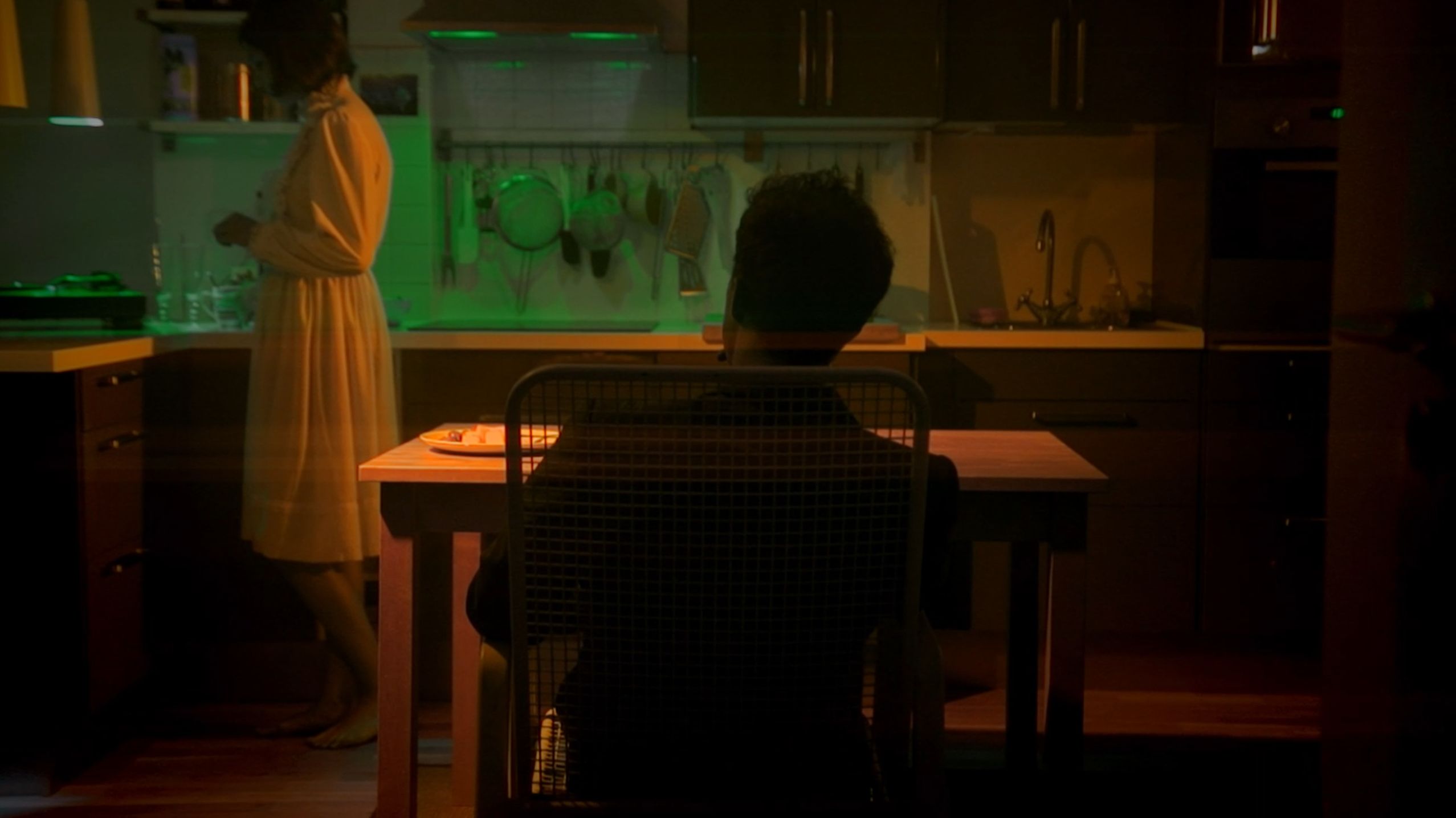 Das ist im Genreumfeld Standard, viele Mysterythriller oder Horrorfilme spielen mit der Unsicherheit der Bilder, lassen Protagonisten und Protagonistinnen im Unklaren, damit einhergehend das Publikum, was zum Teufel da gerade geschieht. Was viele machen, das ist bewährt. Das kann aber auch schnell langweilig werden, wenn entsprechende Einfälle fehlen, diesem Standard auch etwas Eigenes zu geben. Bei Hager besteht das Besondere in der Verpackung: ein schillernder Trip, gerne in Neonfarben, manchmal verfremdet. Oder zumindest ungewohnt. Der Film beginnt mit mehreren Plansequenzen, erst bei der Razzia, später in einem Restaurant. Bei letzterem schleicht die Kamera hinter den Menschen her, zeigt keine Gesichter, lässt höchstens erahnen, wo wir uns befinden und was geschieht.