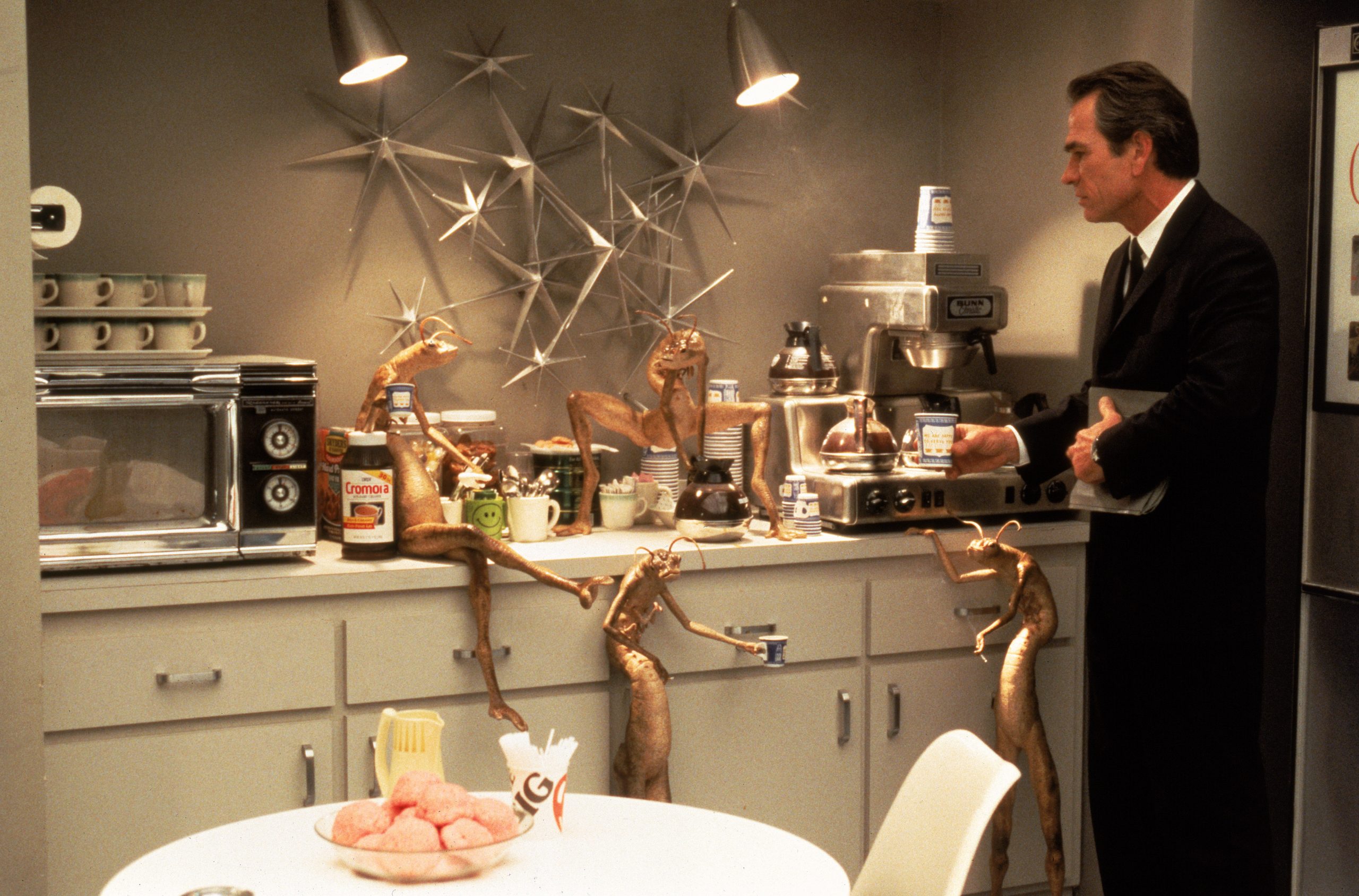 Mangelnde Abwechslung brauchte man hier dennoch nicht zu befürchten. Vielmehr ist Men in Black vollgestopft mit den unterschiedlichsten Lebensformen aus den Weiten des Alls. Einige davon kommen einem etwas bekannter vor, orientieren sich etwa an tierischen Vorbildern. Bei anderen weiß man gar nicht so recht, was man da nun genau sieht. Aber eben darin liegt auch der Spaß, zumal selbst das Bekannte nicht zwangsläufig langweilig ist. Tatsächlich ist einer der Running Gags, dass das böse Oberalien, um das sich alles dreht, letztendlich „nur“ eine Schabe ist. Aber eben eine, die besonders groß und grausam ist, keine Skrupel kennt und schon mal etwas brutaler wird, wenn ihren kleineren Verwandten ein Fühler gekrümmt wird.