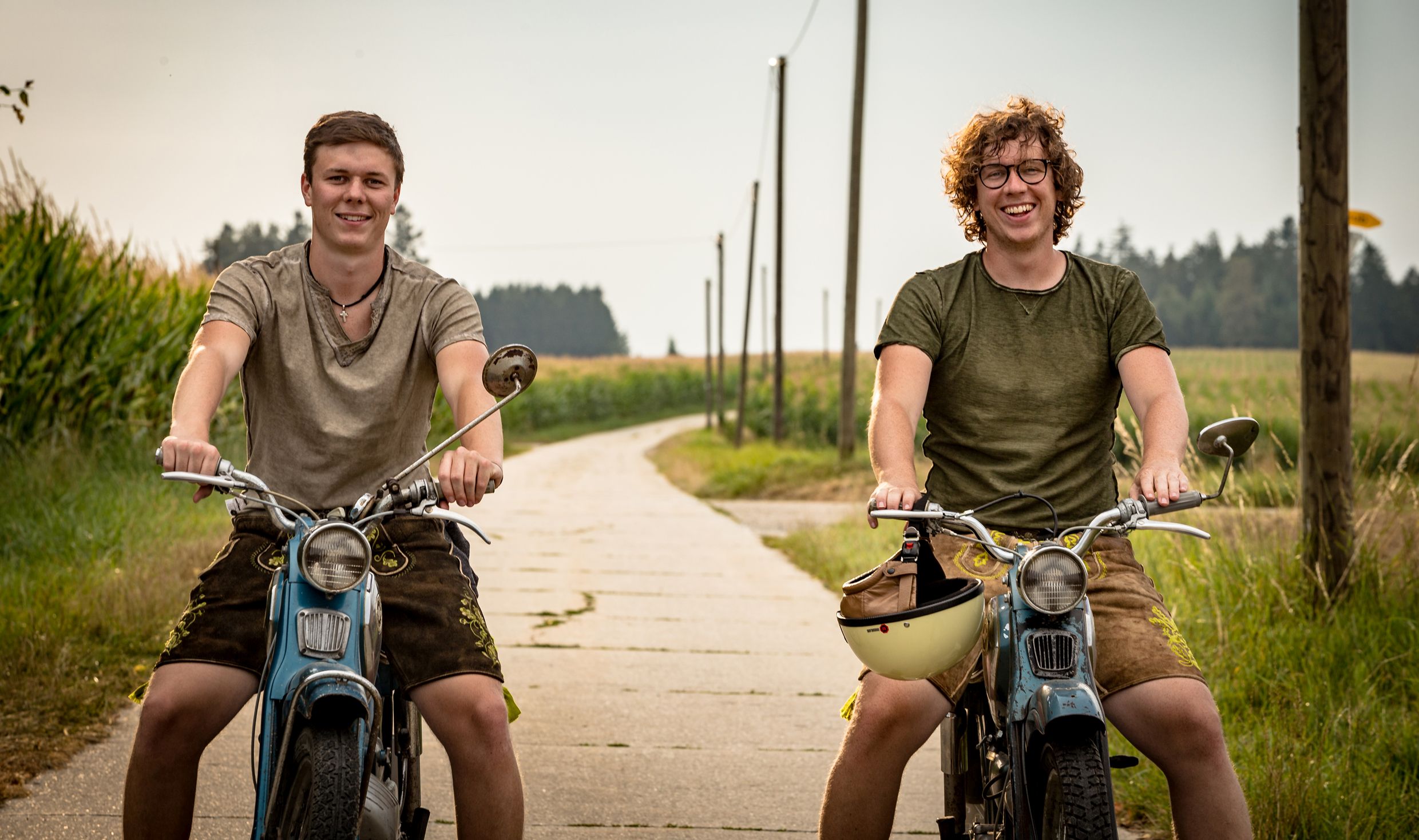 Ausgrissn! versucht auf zwei Weisen, sich von dem großen Angebot ähnlich angelegter Filme emanzipieren zu können und mit etwas Eigenständigkeit zu punkten. Die eine ist bereits in dem Untertitel „In der Lederhosn nach Las Vegas“ versteckt. Hier geht es eben um zwei bayerische Burschen – die Brüder Julian und Thomas Wittmann –, die gemeinsam den alten Traum von Amerika verfolgen, indem sie mit ihren Mopeds über die Highways tuckern, das Endziel Las Vegas vor den Augen. Die US-Glitzermetropole und betonte regionale Identität im Süden Deutschlands, klar dass bei sowas Welten aufeinanderprallen. Der Dokumentarfilm will mit diesen Culture-Clash-Elementen auch spielen, gerne unter Zuhilfenahme von Klischees.