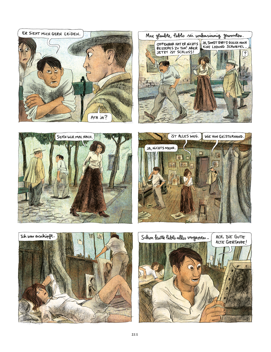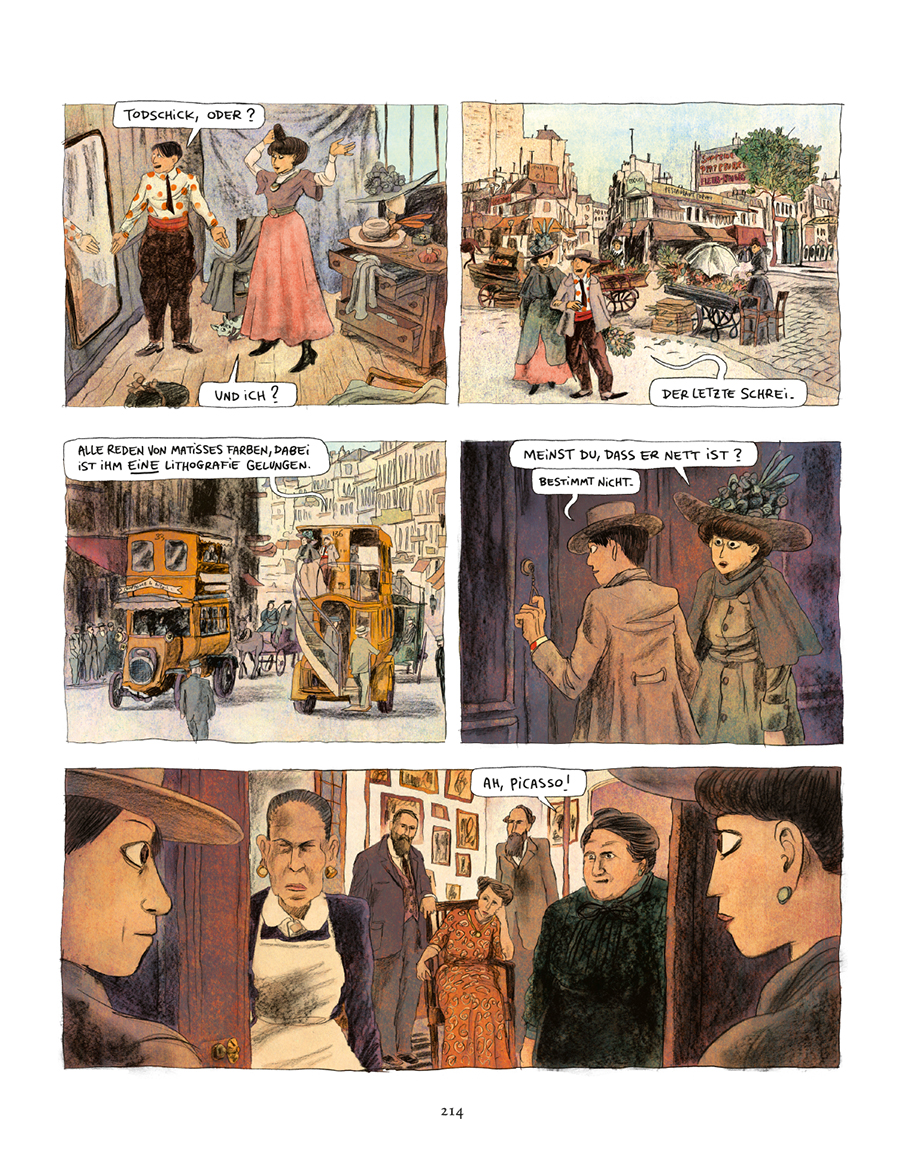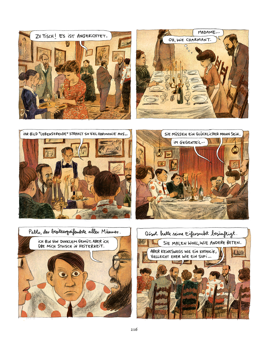 Clément Oubrerie Illustrationen ergänzen diese Geschichte mit der Zeichnung dieser einzigartigen und unwiederbringlichen Welt des Paris um 1900. Immer wieder zeigt er die kleinen Anekdoten, die Hierarchien und das Chaos des Montmartre, doch auch die Opiumvisionen von Pablo und Fernande sowie diverse Ausflüge in die Fantasie des Künstlers, wie er die Welt sieht und sich in ihr bewegt.