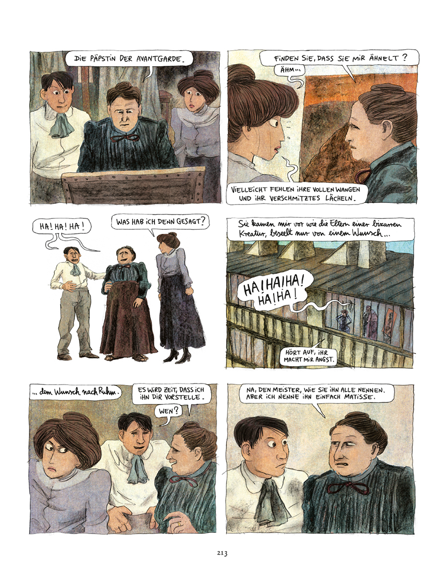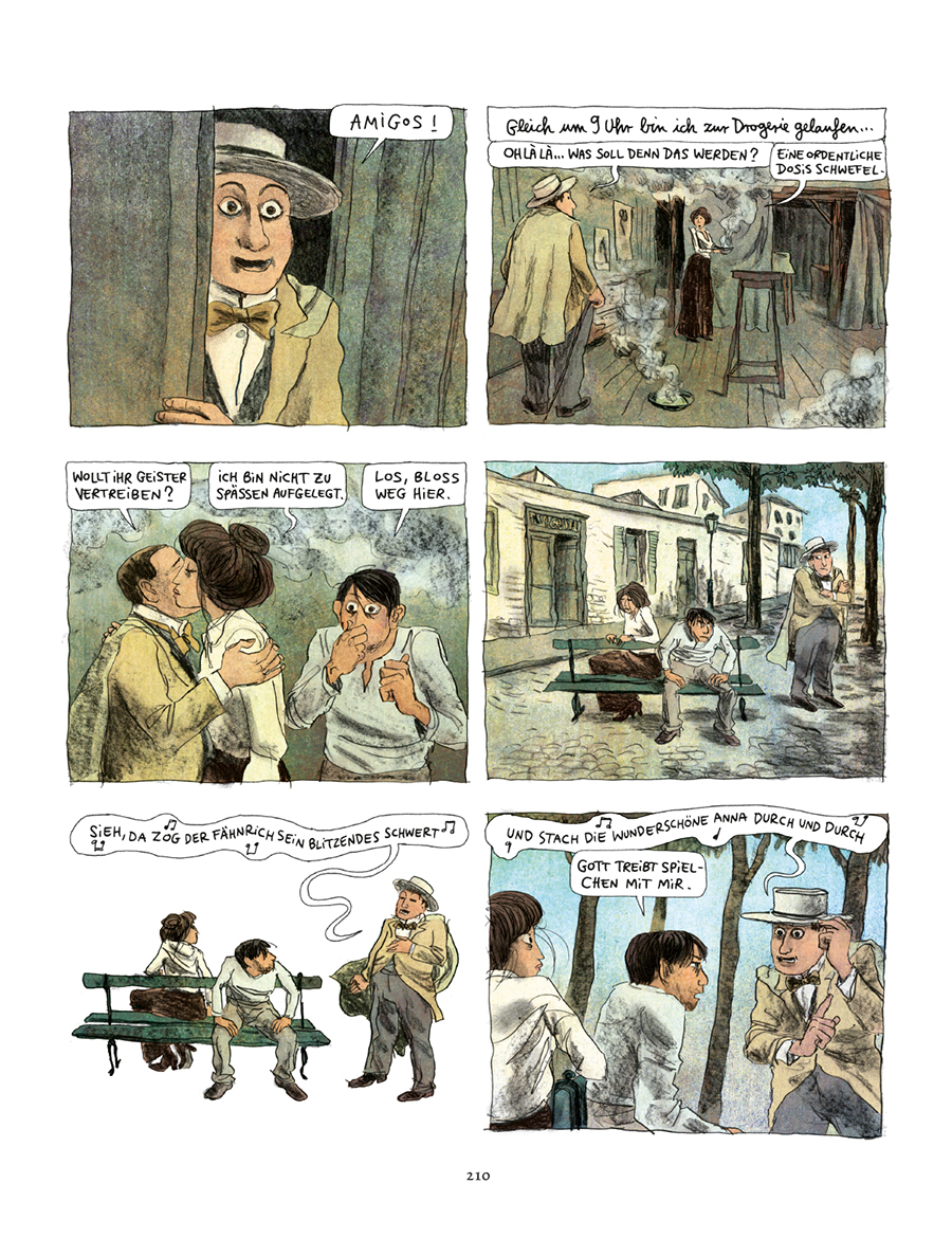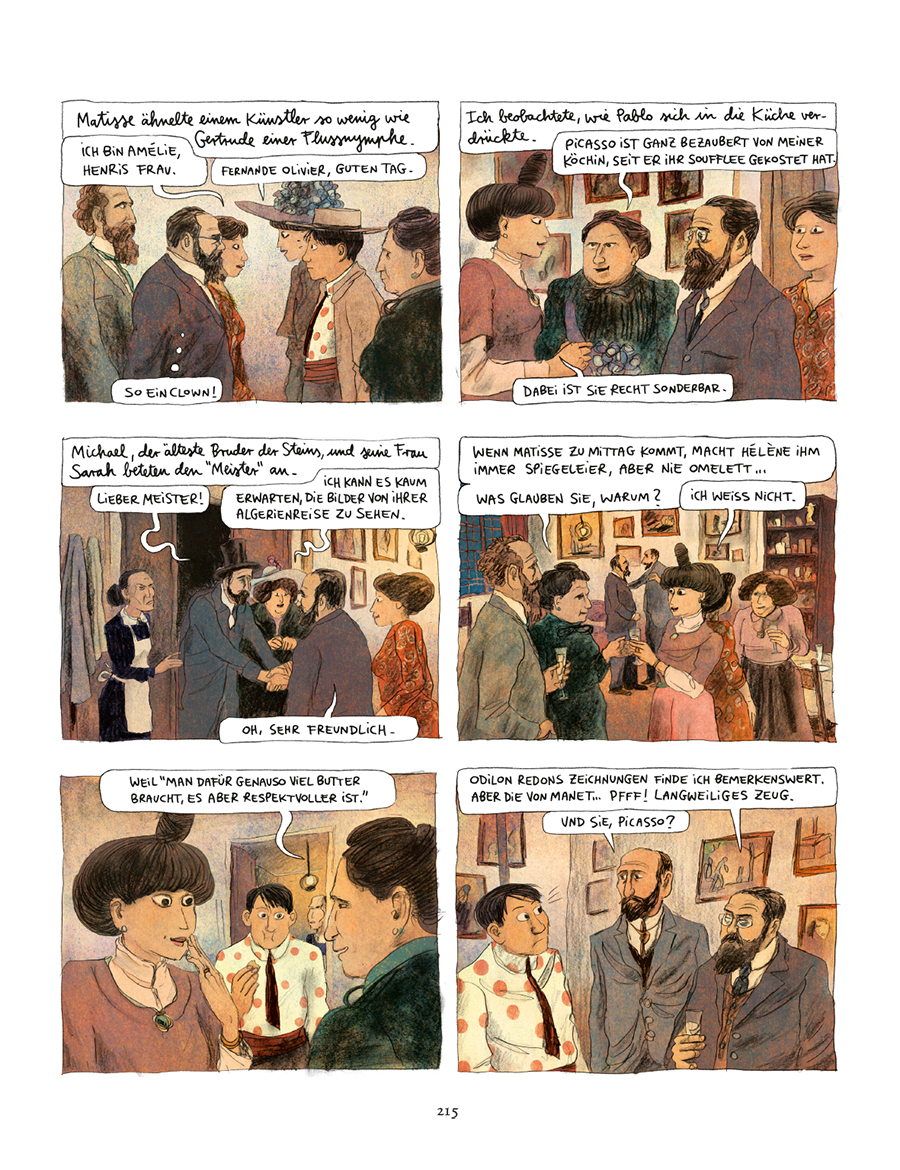 Clément Oubrerie Illustrationen ergänzen diese Geschichte mit der Zeichnung dieser einzigartigen und unwiederbringlichen Welt des Paris um 1900. Immer wieder zeigt er die kleinen Anekdoten, die Hierarchien und das Chaos des Montmartre, doch auch die Opiumvisionen von Pablo und Fernande sowie diverse Ausflüge in die Fantasie des Künstlers, wie er die Welt sieht und sich in ihr bewegt.