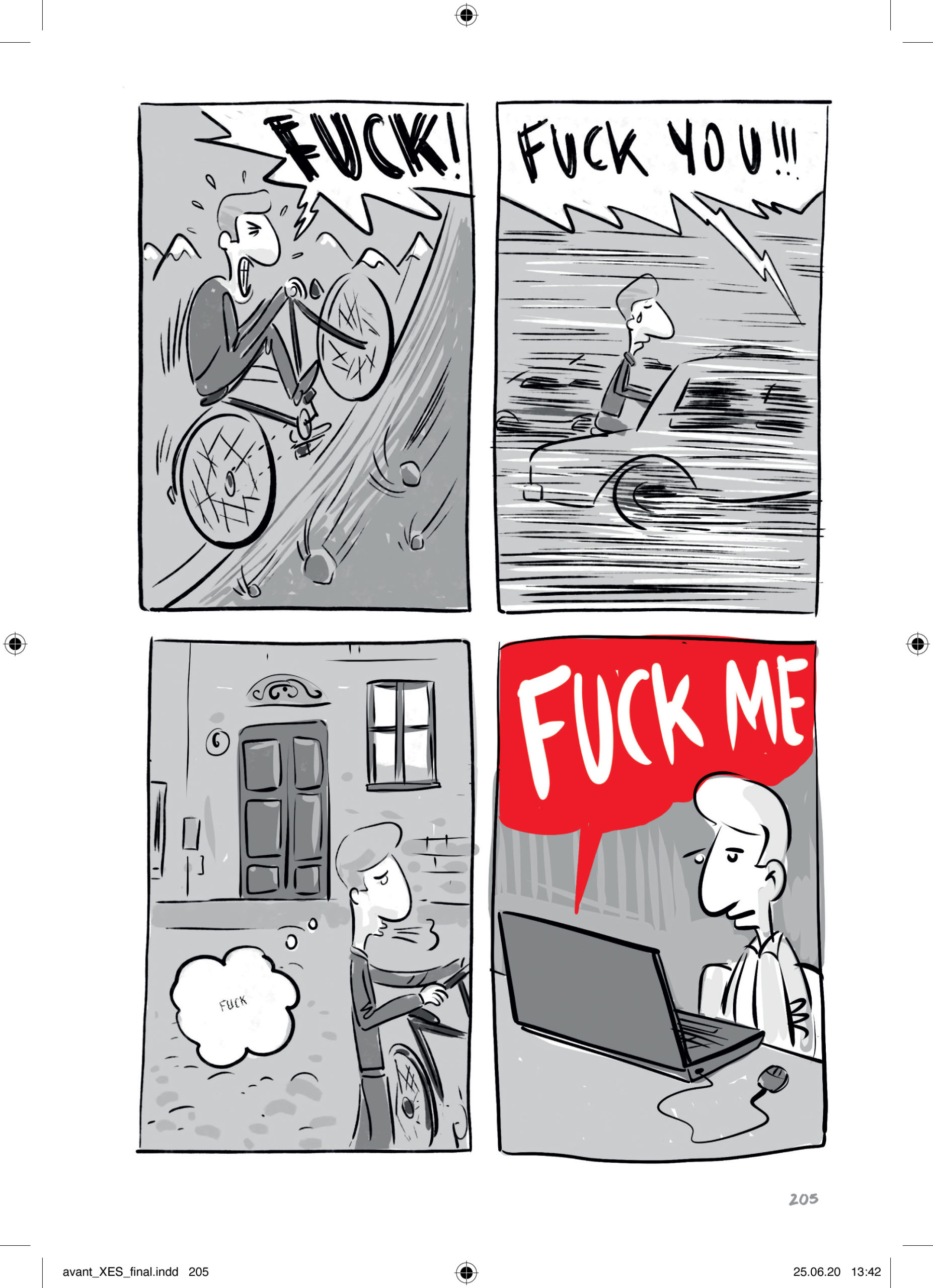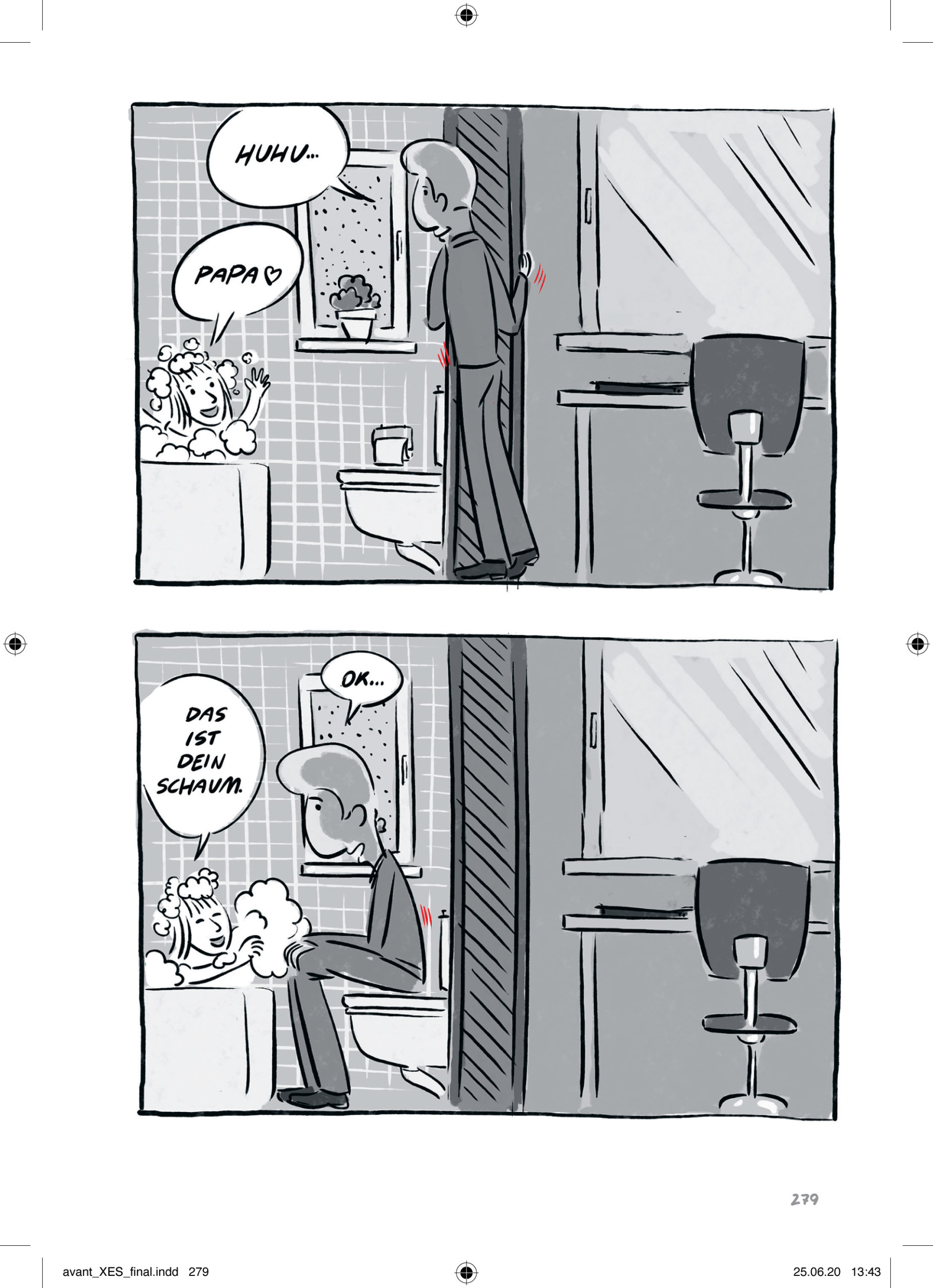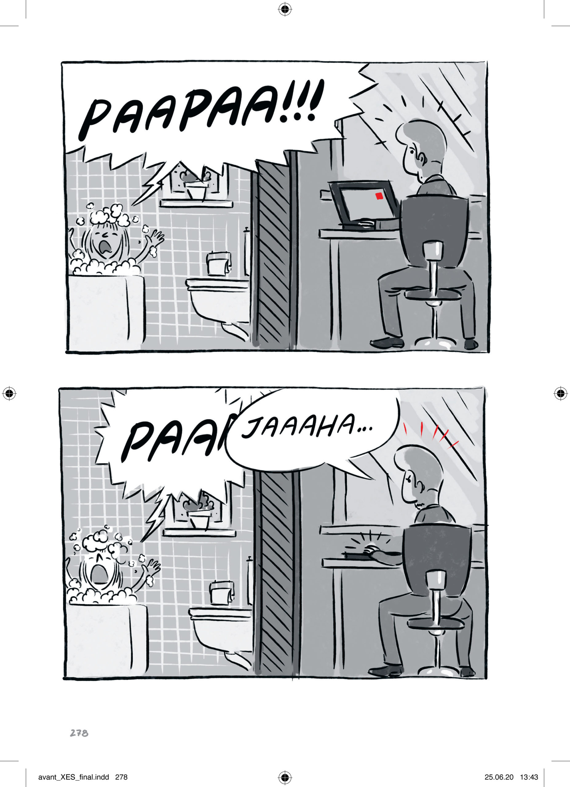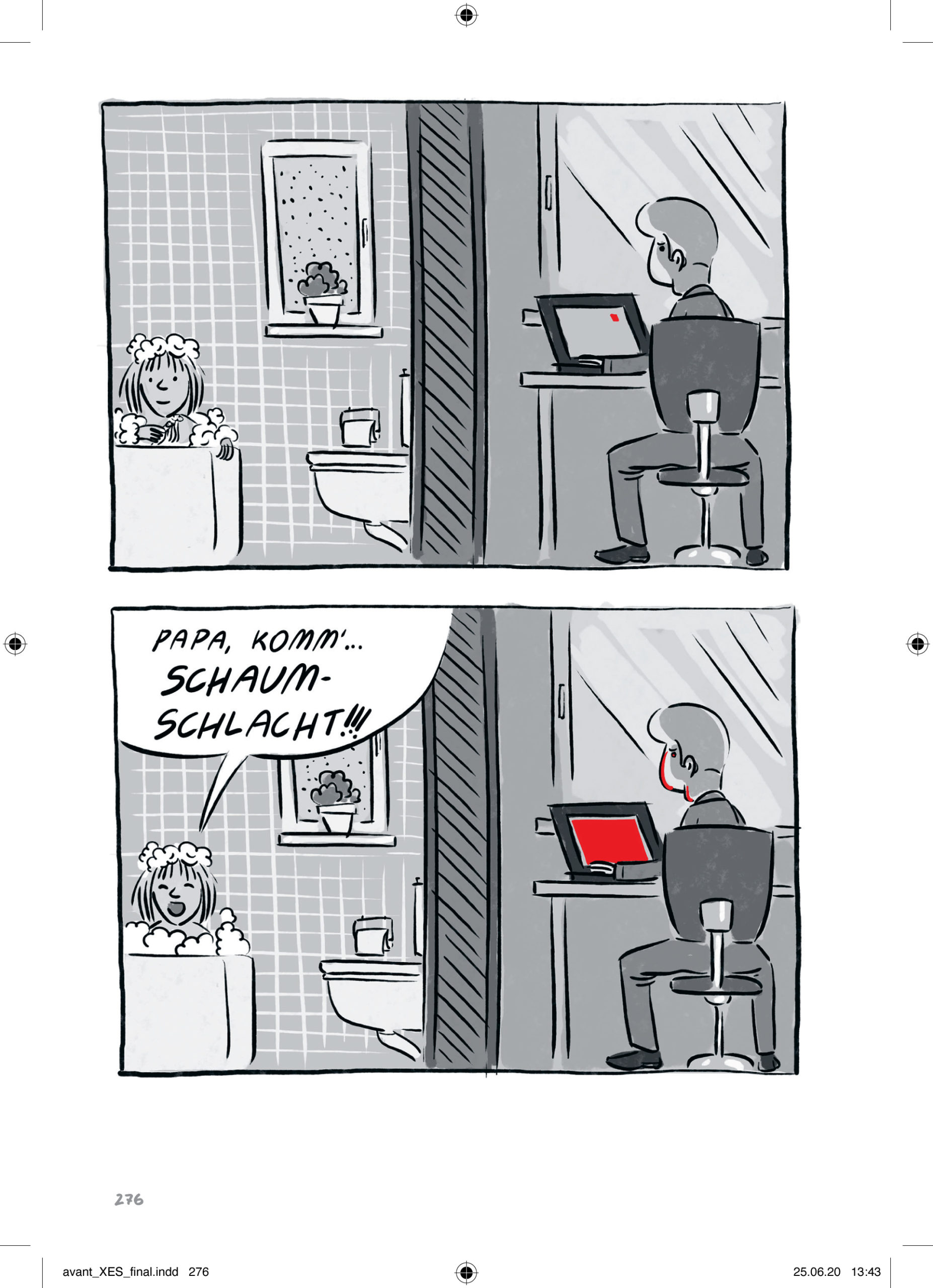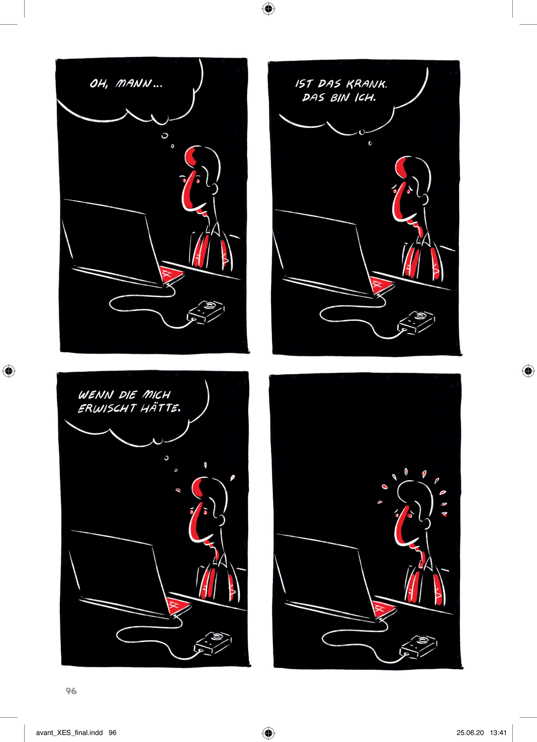 In gewisser Weise hat XES eben jenen Charakter des mündlichen Berichts, wie man ihn auf einem Treffen einer Selbsthilfegruppe wohl hören würde. Auch wenn die Erzählung als solche einen dramaturgischen Aufbau besitzt, springt sie immer zwischen den Zeiten, erzählt von einem bezeichnenden Erlebnis aus der Jugendzeit in der Familie nur um dann wieder in die Gegenwart zurückzukommen und den abermaligen Besuch in einem Bordell zu schildern. Darüber hinaus gibt es surreale, albtraumhafte Passagen, die mit viel Fantasie beispielsweise die Sucht als eine Art übermächtiges Monster beschreiben, welches immer größer wird und letztlich die Welt zu zerstören droht. Mit einfachen Mitteln und einer klaren Farbgebung, die alles, was mit Sucht und Sexualität zu tun hat, in ein tiefes Rot taucht, verdeutlicht Winter, wie teilweise zufällig die Sucht in den Alltag eindringt und eine augenscheinlich normale Situation in ein anderes Licht rückt.