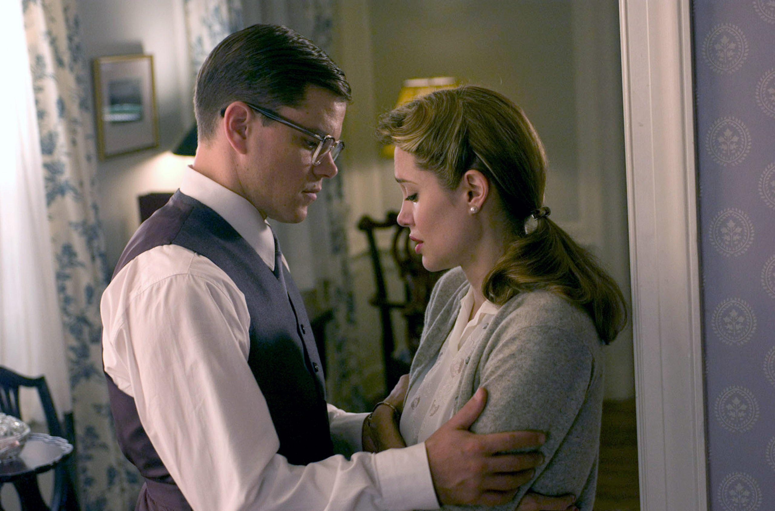 Dabei wurde hier schon richtig viel aufgefahren und keine Mühen gescheut. Vor allem das Ensemble ist geradezu absurd mit den vielen Prominenten, die sich darin tummeln. Auch wenn Damon, Jolie und De Niro als Aushängeschilder fungierten, daneben finden sich eine ganze Reihe weiterer illustrer Namen: Ob Alec Baldwin oder William Hurt, Lee Pace oder Eddie Redmayne, Joe Pesci oder Martina Gedeck, Der gute Hirte ist mit Stars prall gefüllt. Dass viele von ihnen nur verschwindend kleine Rollen haben, bleibt da nicht wirklich aus. Obwohl die Laufzeit mit knapp drei Stunden ziemlich üppig ausfällt, ist das am Ende nicht genug, um allen gerecht zu werden. Schließlich heißt es hier, nicht nur eine Figur genauer vorzustellen. Vielmehr sollte das hier ein Zeitporträt sein, welches die Ereignisse in den USA zur Mitte des 20. Jahrhunderts festhalten sollte, gerade im Hinblick auf die Außenpolitik.