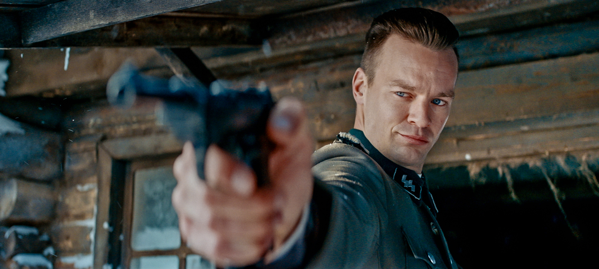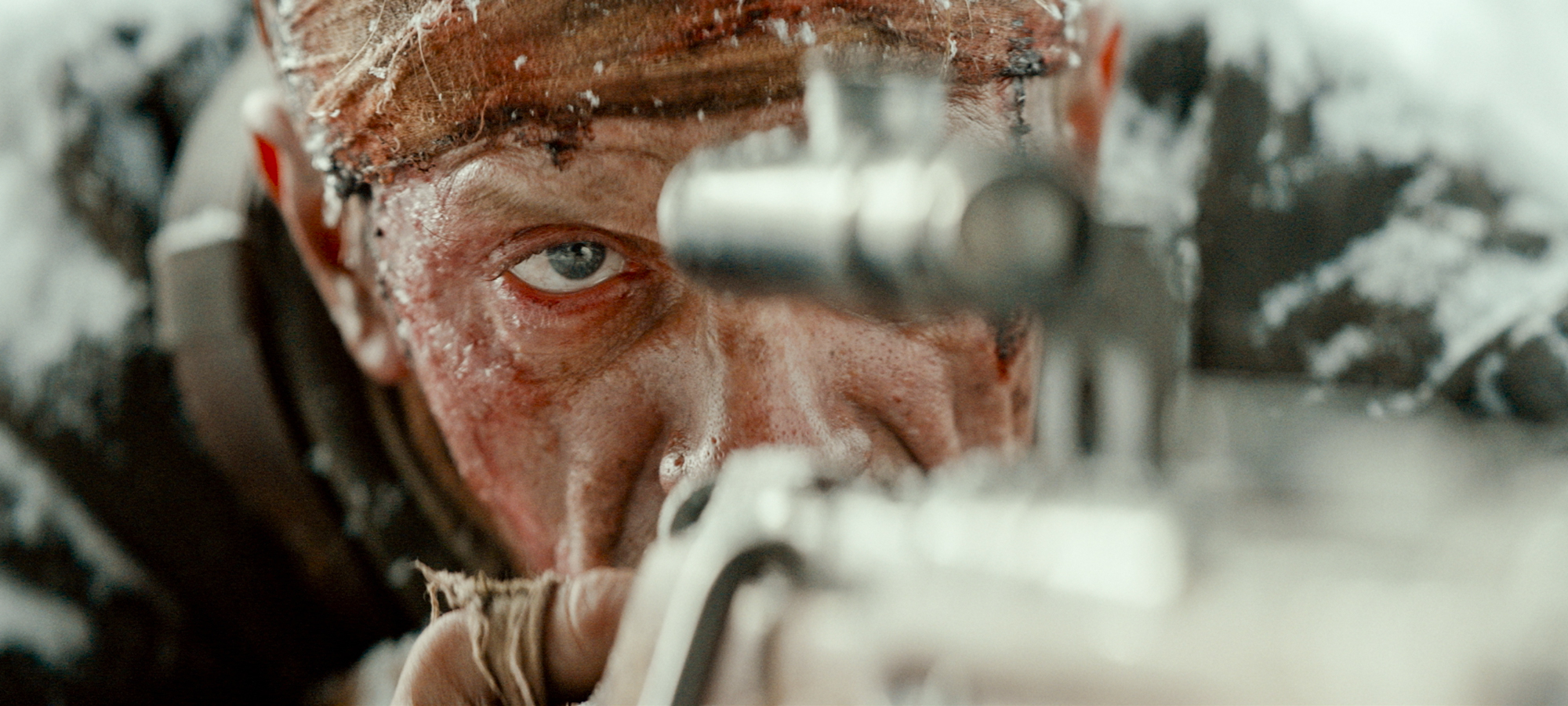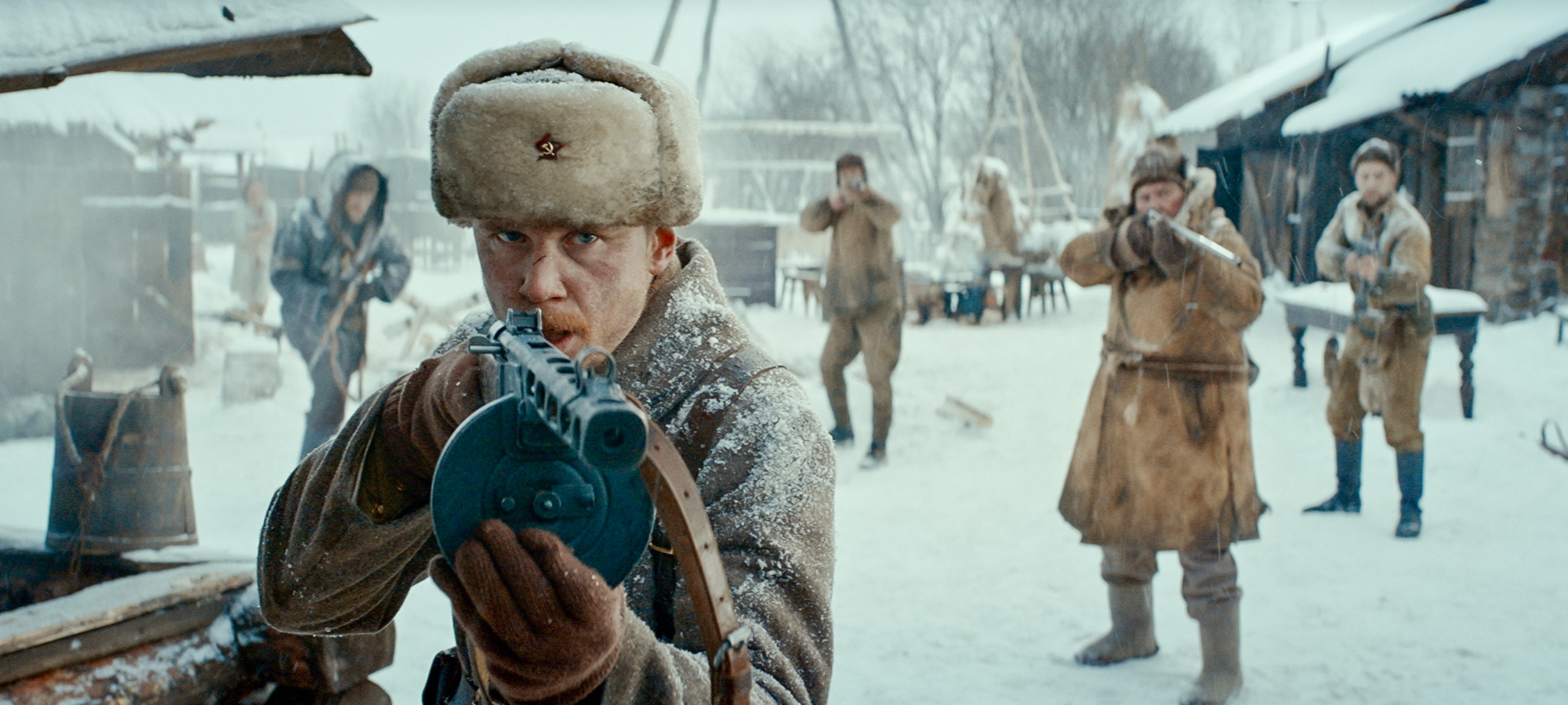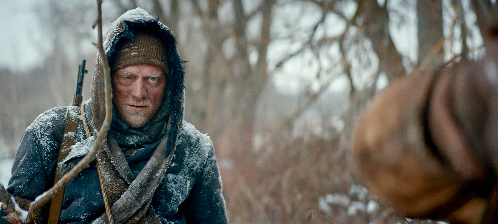 Ein roter, kommunistischer Geist, der ganz allein viele dutzend deutsche Soldaten ausschaltet und wie ein Robin Hood Gold und Reichtum in Form von Hoffnung an die armen Flüchtigen verteilt. Ein konzeptioneller Rächer, der interessanterweise gar nicht die Rolle des Protagonisten einnimmt. In Red Ghost – Nazi Hunter ist er eine Legende, eine stille Post, die in den Reihen der deutschen und russischen Truppen seine Runden zieht und omnipräsent seinen Schatten auf das weite, karge Land wirft. Die Geschichten könnten überzogen dargestellt sein, gar ausgedacht, doch als Zuschauende erlebt man die tödliche Präzision sofort mit der ersten Szene, als deutsche Soldaten zwei Entertainer, Ehemann und -frau, inmitten der eisigen Kälte hinrichten wollen. Der unsichtbare Scharfschütze rettet die beiden, eliminiert die Soldaten aus der Ferne, den letzten gar durch den Reifen eines Fahrzeugs hindurch. Er spricht nicht, gibt den beiden etwas Essen mit auf ihre Flucht und macht sich nach der Plünderung der Leichen selbst wieder auf die Reise.