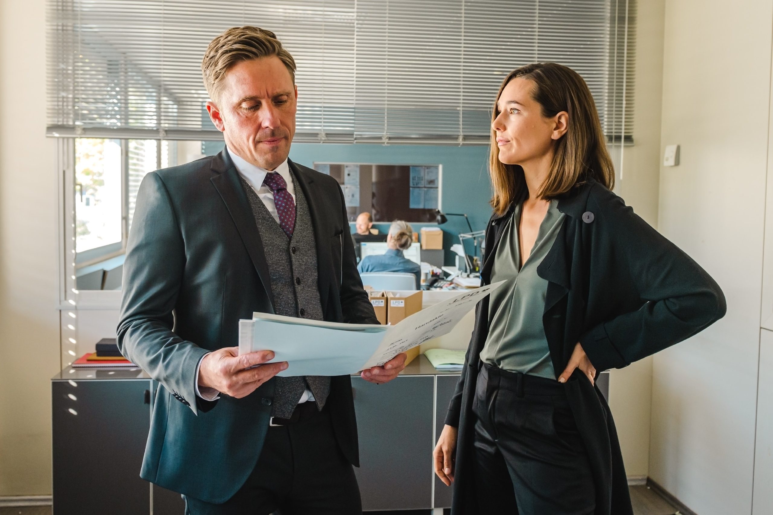 Ein Verkaufsargument ist ebenfalls schon im Titel zu finden: Der Film spielt in den Alpen, genauer im österreichischen Teil davon. Zumindest wird das gesagt, raushören kann man das nicht. Wie auch? Die Hauptdarsteller und Hauptdarstellerinnen sind allesamt deutsch, wie so oft bei hiesigen TV-Krimis, die so tun, als wären sie internationale Produktionen. Nur bei der Gegenseite sind tatsächlich zwei Österreicher zu finden. Aber um Sprache geht es hier ohnehin nicht. Die Ohren bekommen in der Hinsicht recht wenig geboten, die Augen umso mehr. Immer wieder verschlägt es Tom in Einsatz in den Alpen: Der Armbrustkiller in die Berge, wo er entweder Spuren nachjagt, Verbrecher stellt oder um seine tote Paula trauert. Schöne Kulissen gibt es also mehr als genug, das Setting ist der inoffizielle Star in der Runde.