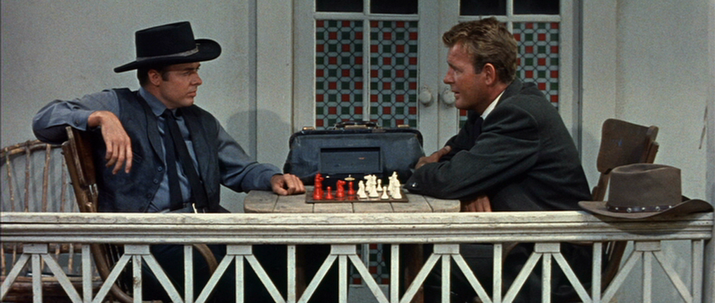 Das einzige Duell, welches die zwei austragen, findet jedoch am Schachbrett statt. Außerdem ist es keine Begegnung, die von einem tatsächlichen Antagonismus geprägt ist. Canfield ist vielmehr neugierig, wer dieser gefürchtete Fremde ist. Es findet ein Austausch statt, bei dem wir mehr über Gant erfahren und seine Überzeugungen. Er ist nicht der typische Böse, auch wenn seine Methode schon sehr perfide ist, die anderen so lang zu provozieren, bis diese zur Waffe greifen und er in „Notwehr“ seinen Auftrag erfüllt. Wo sich Western ursprünglich mit sehr kontrastreichen Schwarzweiß-Figurenzeichnungen, da ist Auf der Kugel stand kein Name deutlich nuancierter. Zum Teil fand man das bei Spätwestern natürlich schon, wenn aus Helden Anti-Helden wurden. Dass der Antagonist mehr ist als das personifizierte Böse, das hat jedoch Seltenheitswert.