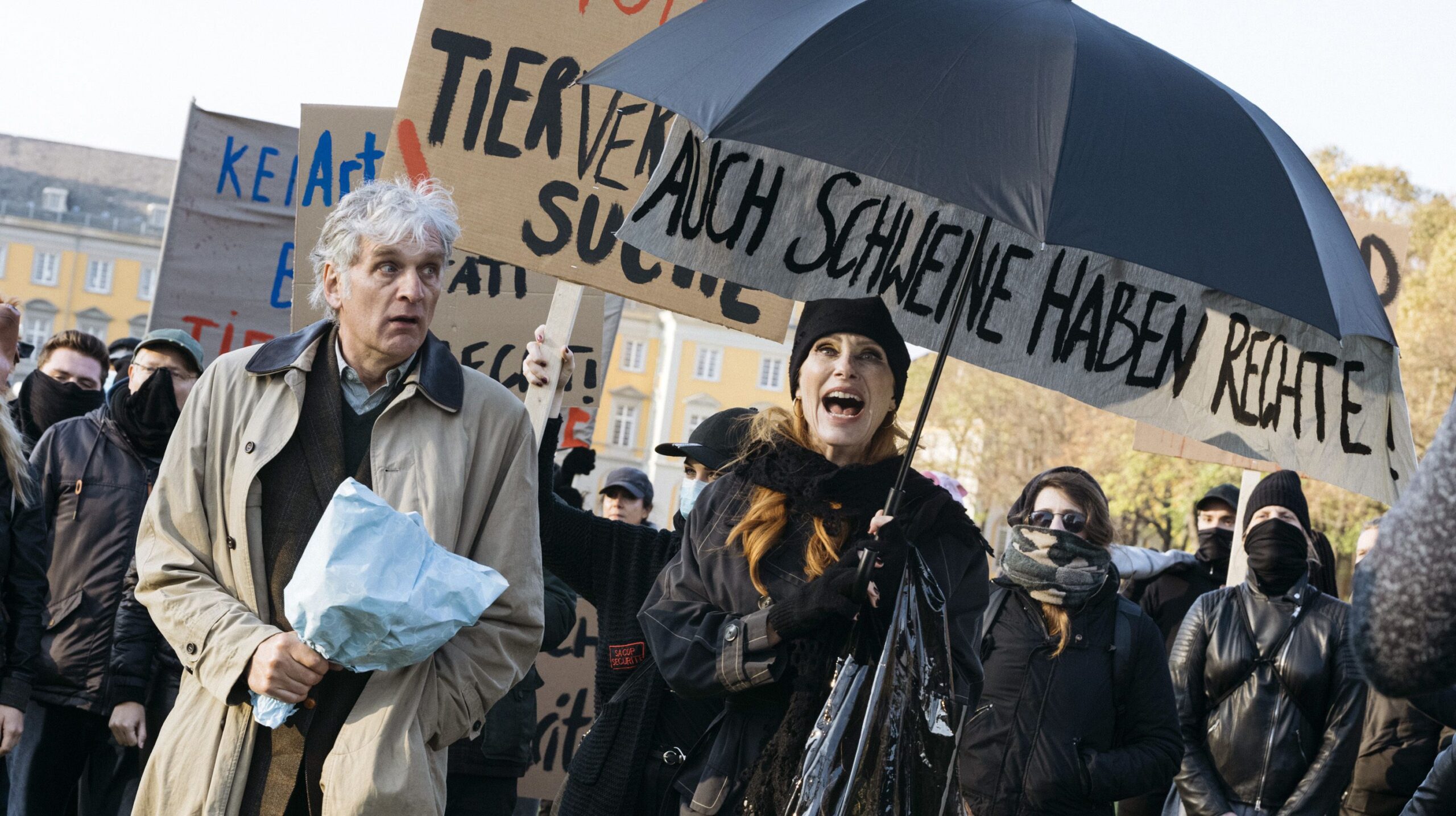 Besser sieht es bei Hanne aus. So gibt es bei ihr diesen irritierenden Gegensatz von eleganter Lebefrau und engagierter Aktivistin. Vor allem aber hat Drehbuchautor Matthias Lehmann ihr die Geschichte um die drei Männer mitgegeben, die alle auffallend schnell nach der Hochzeit gestorben sind. Sterben ist auch keine Lösung lässt dabei zunächst offen, ob das ein Zufall ist oder ob die vornehme Witwe nicht nachgeholfen hat. So oder so ist der Einfall, dass sich jemand umbringen will, indem er eine Mörderin heiratet, doch recht originell. Plausibel ist das kaum, so wie einiges in dem Film keinen Sinn ergibt. Aber das muss bei Komödien nicht schlimm sein. Potenzial hat das Szenario auf jeden Fall, gerade auch im Hinblick auf schwarzen Humor, wenn Liebeswerben und Selbstmord Hand in Hand gehen.