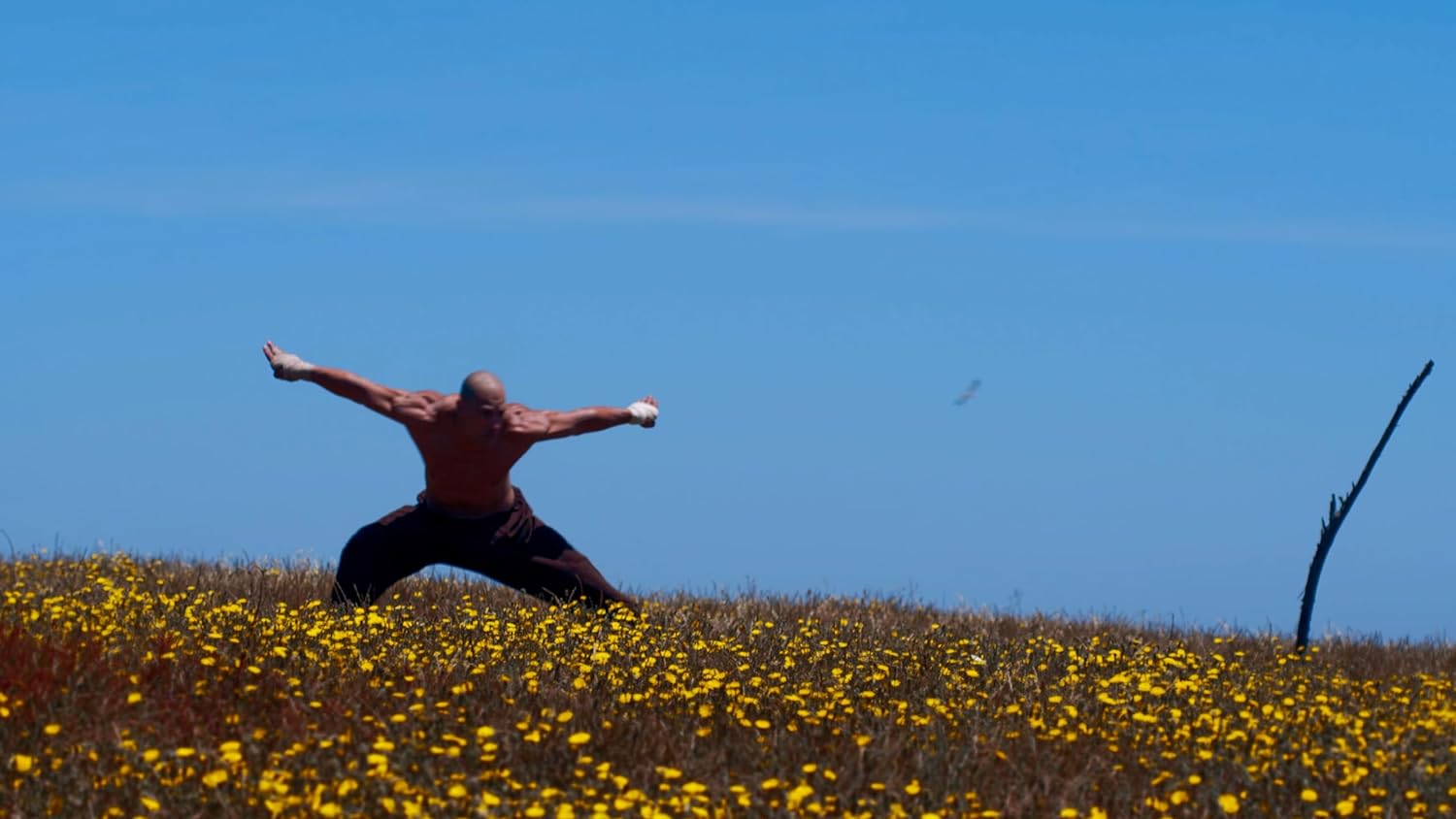 In einer Szene hockt der Kämpfer mit der starken Lichtempfindlichkeit zwischen Felsen und beobachtet seine Familie aus der Distanz. Dass hier kein Dialog stattfindet und die Familie bloß wie eine Art Erinnerung in der Ferne erkennbar ist, ist zwar nicht uninteressant gemacht, um möglicherweise eine emotionale Distanz zu visualisieren, der emotionale Schlag wiederum, der dann mit der Tragödie geschwungen wird, wird dadurch aber etwas abgeschwächt, da man sich an dieser Stelle weniger für „Show“ und mehr für „Tell“ entschieden hat.