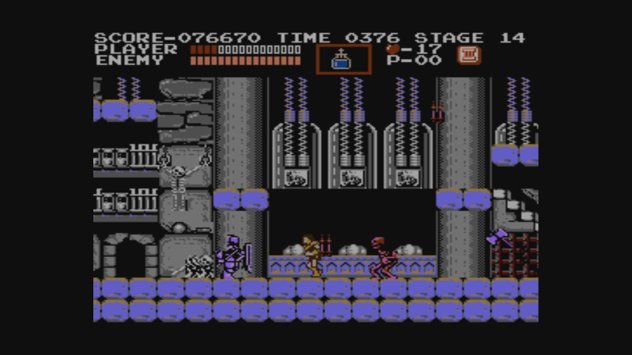 Das Setting war nicht minder abwechslungsreich. Natürlich muss man mit bald 40 Jahren Abstand seine Ansprüche ziemlich herunterschrauben. 1986 war es aber durchaus gut anzusehen, wenn wir uns durch Verliese, Uhrentürme, Labore oder auch die Unterwelt schlagen müssen. Die Levels waren damals noch geradlinig: Es gab mehrere Abschnitte im Schloss, die in einer festen Reihenfolge absolviert werden mussten. Auch das Ziel innerhalb dieser Levels war klar definiert. Bei den späteren Teilen von Castlevania hat sich das gewandelt. Genauer war es Symphony of the Night, das 1997 ein neues Spielprinzip einführte, das sich eher an Metroid anlehnt. Soll heißen: Das Schloss wurde zu einem Gesamtlevel, dessen Teilbereiche sich nach und nach freischalten lassen. Eine Rückkehr zu früheren Bereichen war nicht nur möglich, sondern zum Teil sogar nötig. Auch diese Variante erfreute sich großer Beliebtheit, weshalb diese Art Spiele gern als Metroidvania-Spielen bezeichnet werden. Immer wieder erscheinen Titel, die nach diesem Prinzip funktionieren, aktuell etwa Disney Illusion Island.