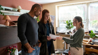 Das liegt einerseits an dem Humor, der hier bewiesen wird. So wird die Begegnung mit der Krimiautorin zum Anlass, immer mal wieder Momente der Komik einzubauen. Sehr nett ist beispielsweise, wie Oliver Wnuk, Hauptdarsteller der Krimireihe Nord Nord Mord, eine fiktionalisierte Version seiner selbst spielt. Insgesamt gibt es in Mordsschwestern – Verbrechen ist Familiensache: Hensleffs letzter Fall ein paar spöttische Szenen, bei denen sowohl Prominente wie auch das Krimigenre als solches aufs Korn genommen werden. Dazu gehören dann auch die Szenen, in denen sich Chef Owe (Mathias Harrebye Brandt) als großer Fan der Hensleff-Krimis outet und voll von Bewunderung für sein Idol ist. Auch wenn da noch mehr drin gewesen wäre, gerade auch bei Meta-Elementen, ist das doch recht amüsant.
