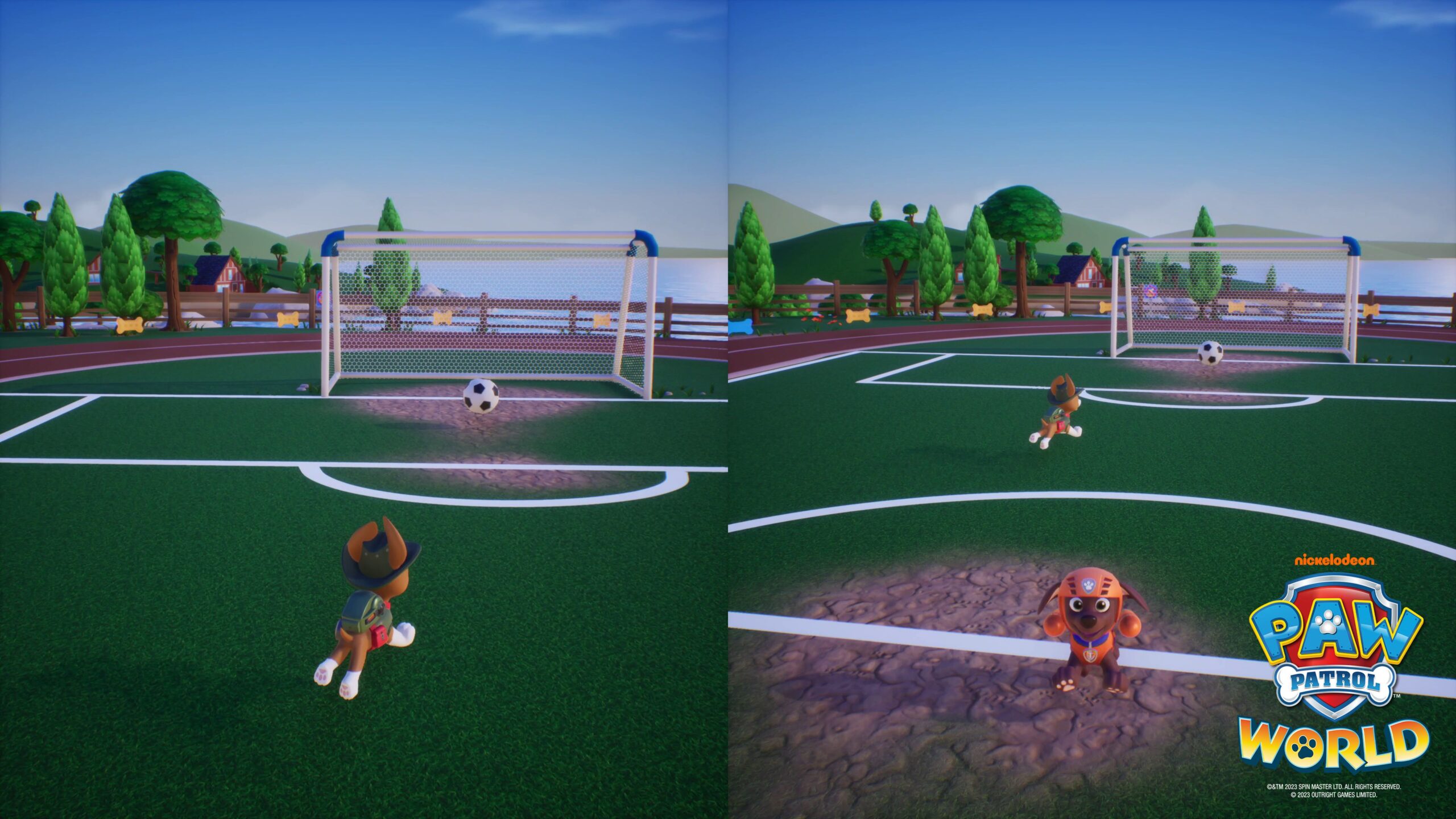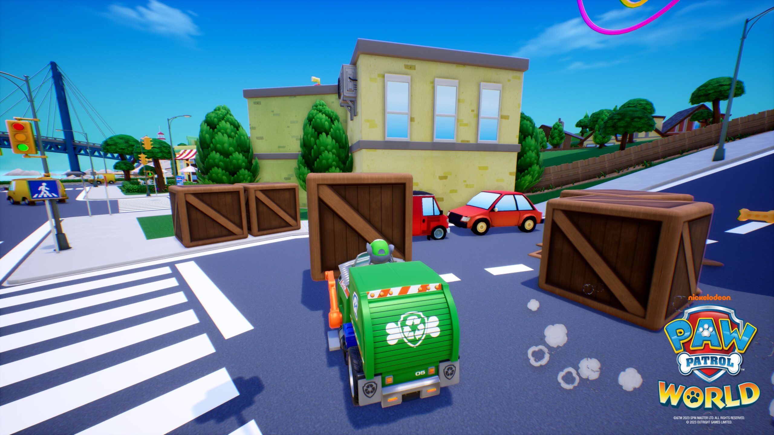 Erwachsene oder selbst jugendlicher Gamer und Gamerinnen wenden sich mit Grauen ab, zumal auch die Grafik nicht gerade ein Hingucker ist. Diese ist zwar durchaus sauber, an manchen Stellen ist es sogar irgendwie süß, wenn die Welpen durch die verschiedenen Schauplätze hüpfen oder mit Feuerwehrwagen oder Luftkissenboot durch die Gegend düsen. Auf dem technisch neuesten Stand ist das aber nicht. Hinzu kommt, dass man bei PAW Patrol World die Kamera nicht wirklich selbst steuern kann. Auch das ist verständlich, die Kinder sollen damit nicht überfordert werden. Und meistens funktioniert das Ganze. Manchmal kommt es jedoch zu unpraktischen Perspektiven, wenn man eine andere Richtung einschlägt und das Spiel etwas braucht, um das wieder in Ordnung zu bringen.