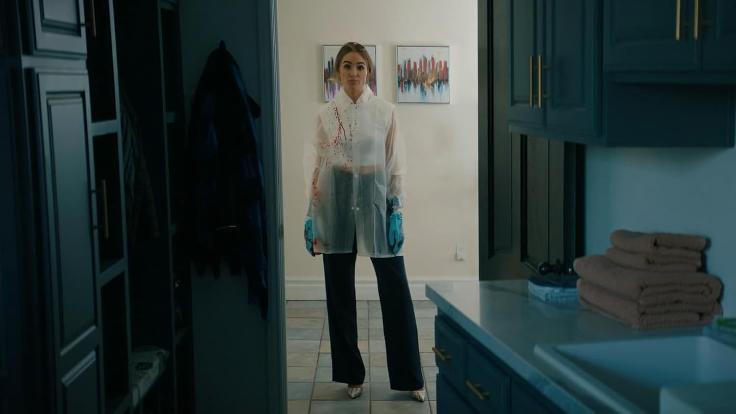 Diese Irritationen machen im Laufe der Zeit Gewalt Platz. Ob man dem Ganzen unbedingt eine FSK 18 hätte geben müssen, darüber kann man sich zwar streiten. Aber es wird schon erstaunlich böse. Zudem hat Drehbuchautorin April Wolfe einige feministische Tendenzen eingebaut. Wirklich überraschend ist das nicht, arbeitete sie zuvor doch auch an Black Christmas, das den Slasher-Klassiker mit einer modernen #MeToo-Aussage verbinden wollte. Ganz so plump wie dort wird es hier zwar nicht. Clawfoot – Blutbad in der Vorstadt erwartet aber schon, dass man Partei ergreift für die Hausfrau, die von ihrem Mann nicht mehr als ein Objekt sieht, das ihm zu gefallen hat. Das darf man dann auch, muss es aber nicht unbedingt. So sympathisch ist die Figur dann doch nicht.
