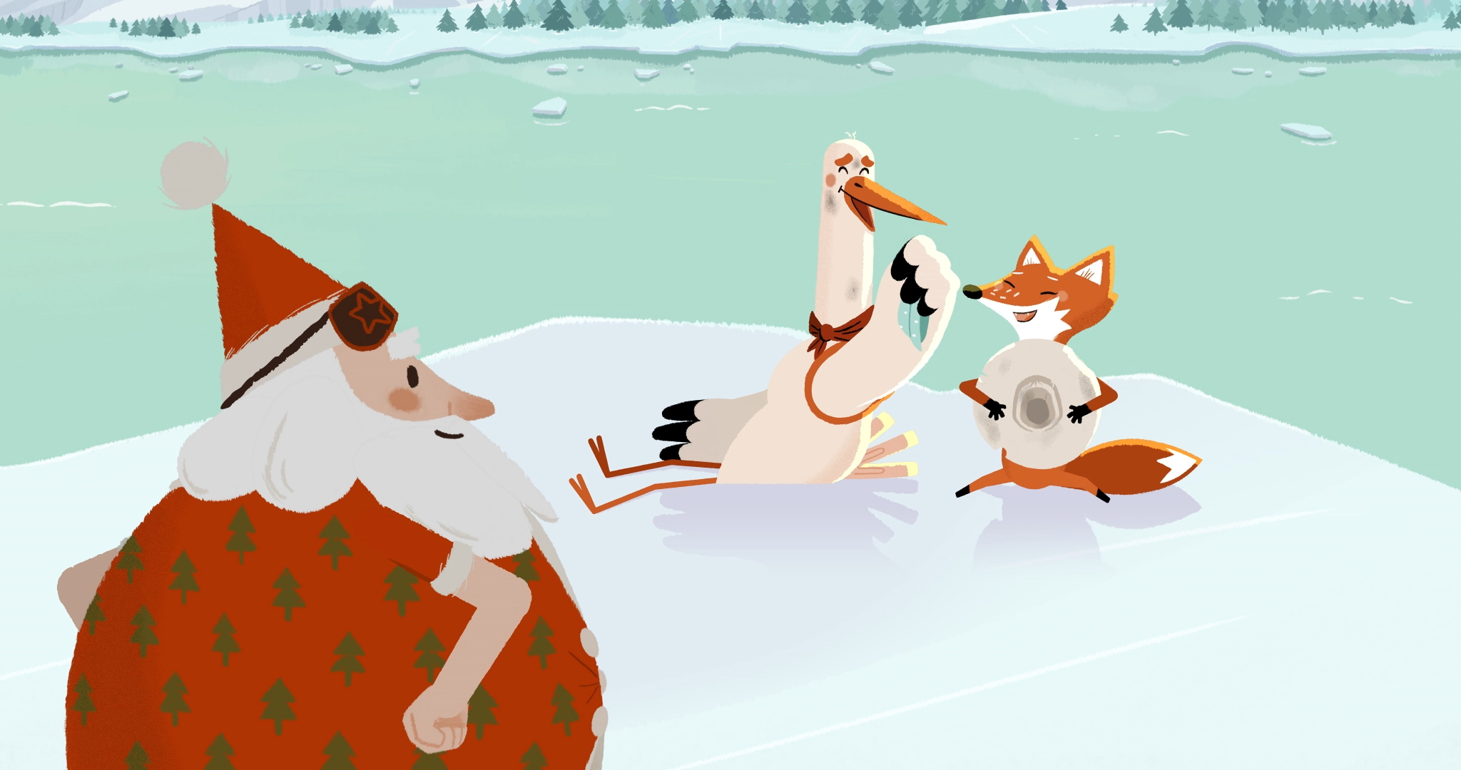 Die Geschichten der fünf Kurzfilme sind insgesamt recht schlicht, was zum einen der Kürze, aber auch der jüngeren Zielgruppe geschuldet sein dürfte. Spaß machen sie aber alle. Sie sind auch erstaunlich abwechslungsreich, wenn man den inhaltlichen Rahmen betrachtet. So mussten alle Abschnitte dem Titel Weihnachten der Tiere entsprechend etwas mit Weihnachten und Tieren zu tun haben. Beim Auftakt Der Weihnachtsmann zieht um von Caroline Attia Larivière folgen wir dem Weihnachtsmann, der gemeinsam mit einem Fuchs und einem Storch eine größere Reise wagt, die nicht immer so klappt wie gedacht. Bei Ceylan Beyoğlus Das erste Weihnachten der kleinen Civciv dreht sich alles um die Hühner eines Bauernhofs, die ihr Weihnachtsfest vorbereiten.
