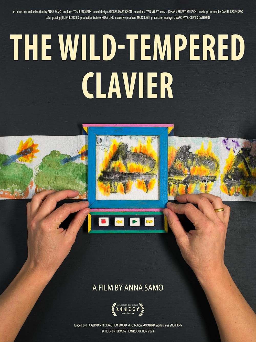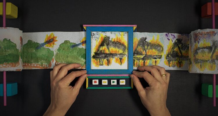 Eigentlich sind Sinn und Zweck von Klopapier recht klar definiert. Der Name sagt schon alles. Das heißt aber nicht, dass man dieses nicht auch anderweitig verwenden kann, beispielsweise als unerwünschte Deko, als Wurfobjekt während einer Vorführung von The Rocky Horror Picture Show oder auch als Bastelmaterial. Anna Samo hat in The Wild-Tempered Clavier eine ganz eigene Idee, was sich damit anstellen lässt, indem sie in ihrem animierten Kurzfilm aus einer Rolle eine Filmrolle macht. Genauer hat sie die einzelnen Blätter bemalt, die sie nacheinander vorbeilaufen lässt und auf diese Weise den Eindruck erweckt, als würden sich die Bilder bewegen. Wie ein Daumenkino also. Drumherum hat sie jedoch eine Art Schneidemaschine gebastelt, durch die das Klopapier läuft. Mit einer realen Maschine hat das dann nicht viel gemeinsam, soll es aber auch nicht. Das sieht mehr nach einem Spielzeug aus.