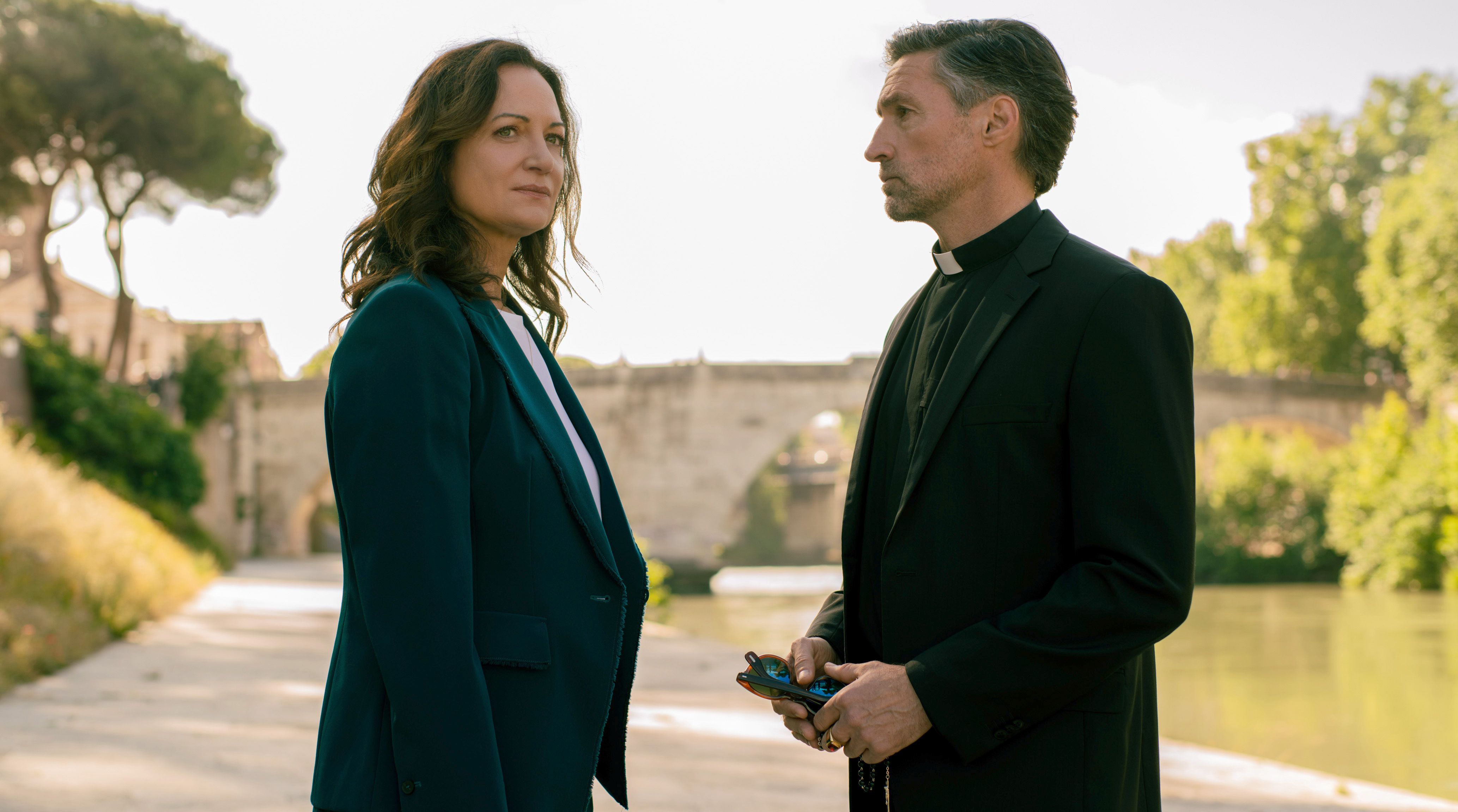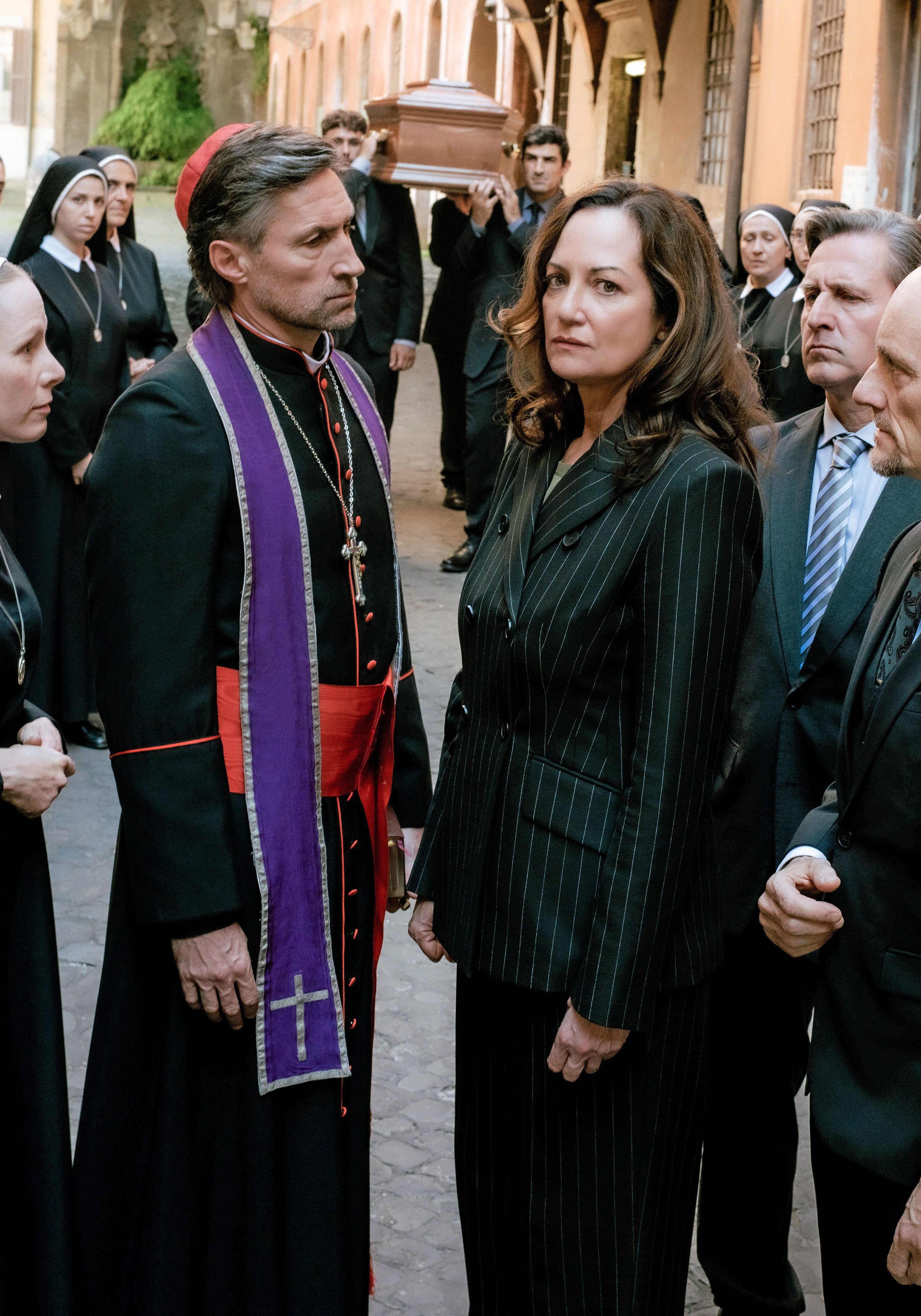 So knüpft der Film gleich in mehrfacher Hinsicht an den Vorgänger an. Vor allem der Anschlag auf Horava wird diverse Male thematisiert, ohne dass wirklich verraten würde, was dahintersteckt. Es gibt zudem ein Wiedersehen mit der italienischen Hauptkommissarin Ricarda Motte (Clelia Sarto), die auch schon beim letzten Teil in die Ermittlungen involviert war. Man richtet sich da also an ein wiederkehrendes Publikum, zumal man nicht viel Zeit investiert hat, um die Figuren vorzustellen. Das wird trotz des neuen Titels als bekannt vorausgesetzt. Der Fall selbst ist hingegen völlig neu, steht völlig für sich. Insofern braucht es nicht zwangsläufig Vorkenntnisse, um Die Diplomatin in Rom: Tod einer Nonne folgen zu können. Das Opfer ist neu, die Täter sind es auch, Verbindungen zum vorangegangenen Verbrechen gibt es keine.