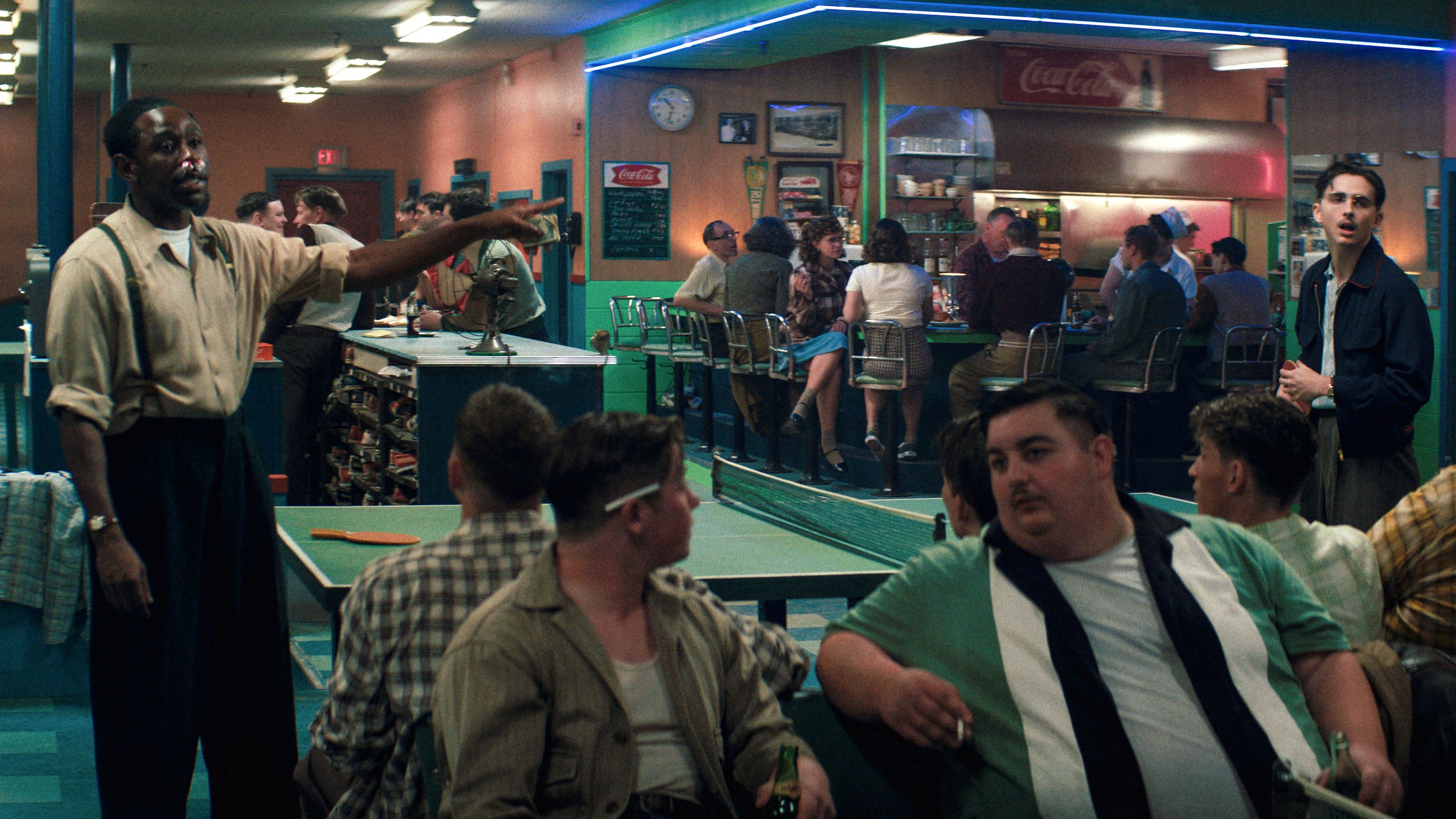 Eine der vielen Stärken von Marty Supreme liegt in Safdies Charakterzeichnung. Jede Figur rund um Marty bekommt genug Raum, um eine eigene Identität zu entwickeln. Über Tischtennis-Hustler, Geschäftsleute, Freunde und Gangster sind es die Nebencharaktere, die ein authentisches Bild eines New Yorks der Nachkriegszeit zeichnen. Der Zeitgeist der 50er Jahre mit wirtschaftlichem Aufschwung und generellem Optimismus findet sich parallel dazu prominent im Wesen des Protagonisten wieder. Marty Supreme ist fast ausschließlich figurengetrieben. Die Handlung des Films ergibt sich aus den Konflikten zwischen den Figuren; frei nach dem Motto „Show, don’t tell“ ist die Exposition subtextuell und demnach organisch eingeflochten. Im Mittelteil des Films gibt es einzelne repetitive Handlungselemente, die kaum mehr zur Etablierung von Martys Persönlichkeit beitragen. Dank des ansonsten rasanten Erzähltempos und des pointierten, sehr bissigen Humors des Films ist Marty Supreme trotz einer Laufzeit von zweieinhalb Stunden durchgehend kurzweilig.