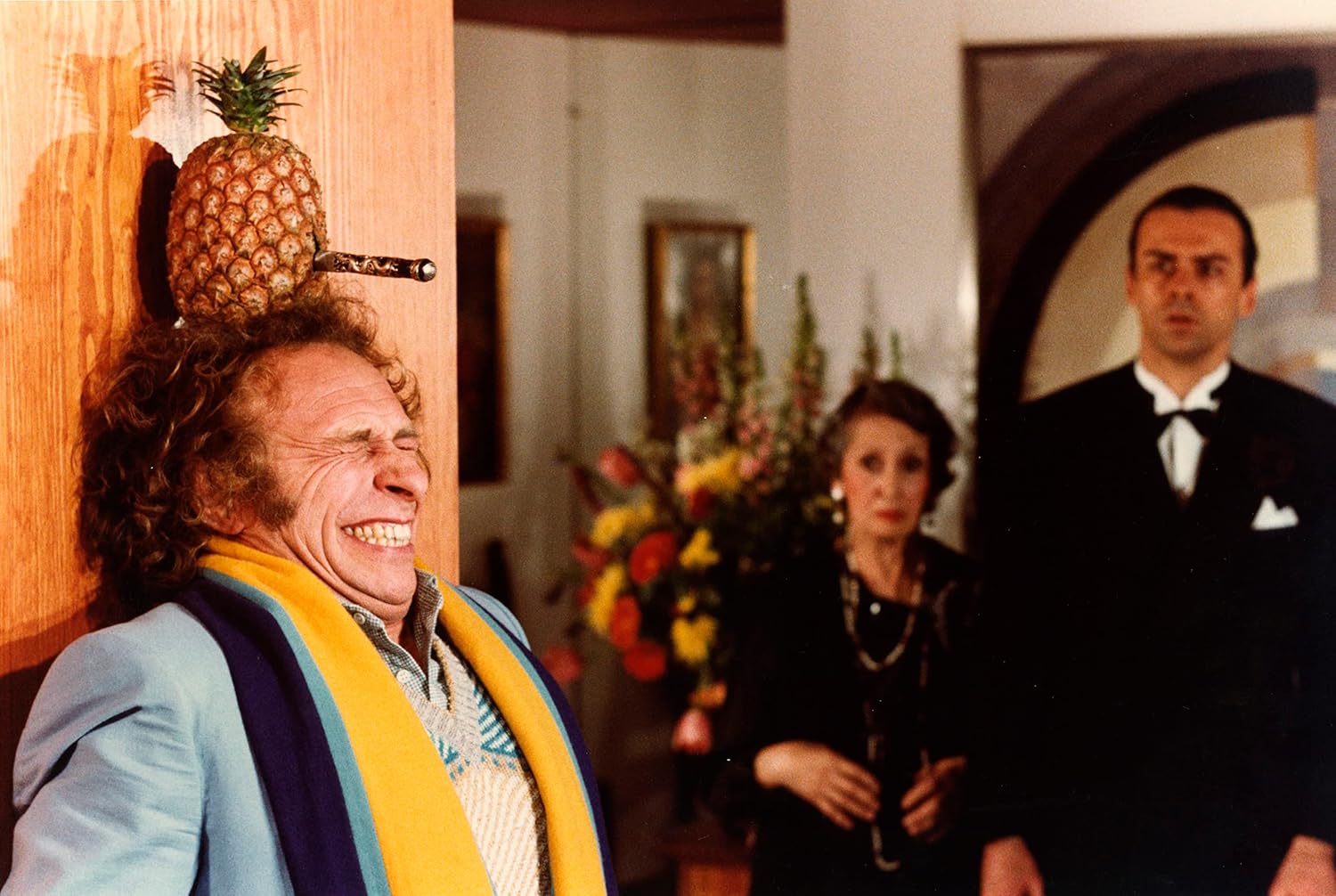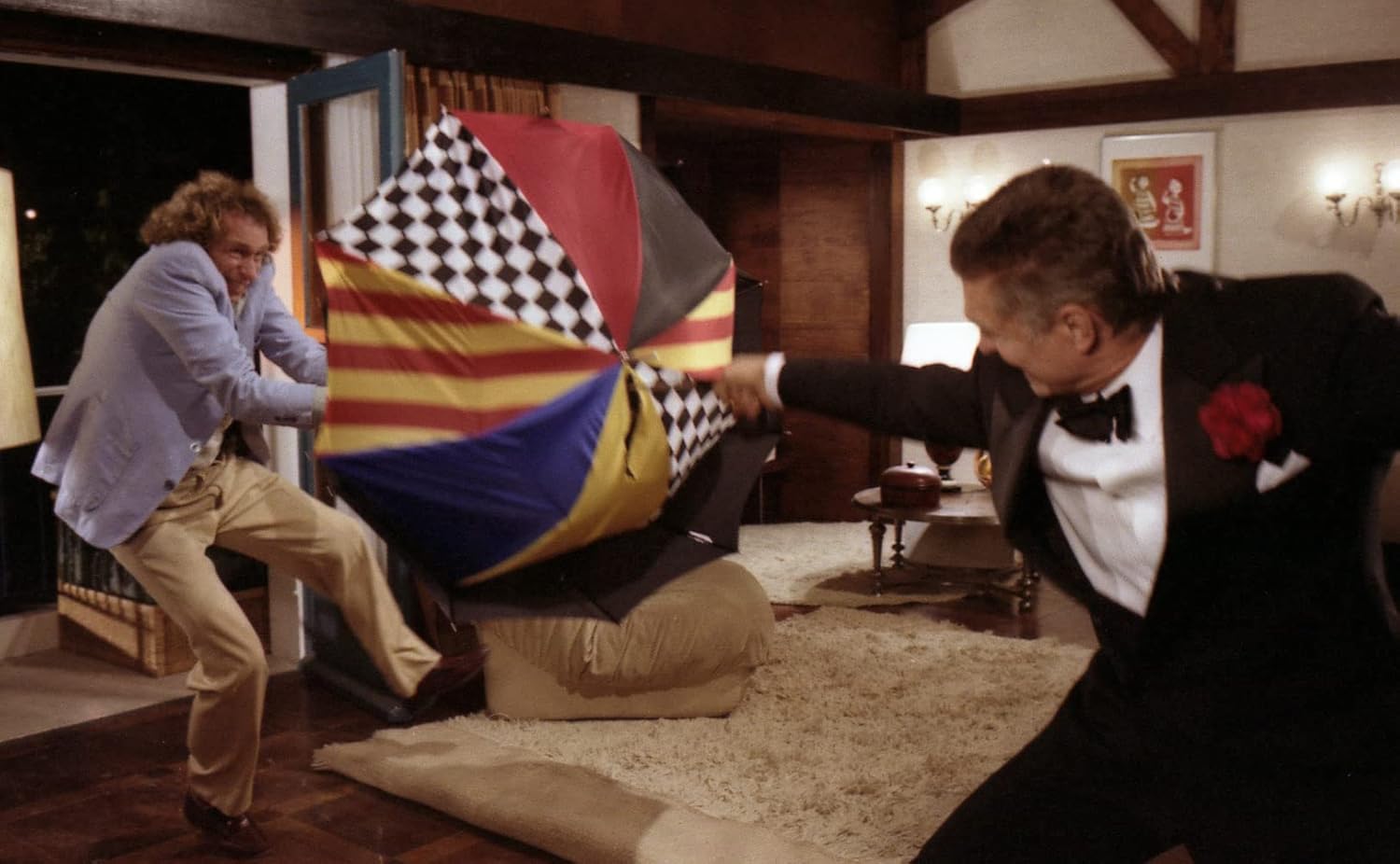 Dass es überhaupt so viele waren, lag zum Teil sicher an der Besetzung. Oury konnte sich bei dieser wie so oft auf große Namen verlassen, allen voran Pierre Richard in der Hauptrolle des Schauspielers, der für einen Killer gehalten wird. Der französische Komiker ist natürlich nicht unbedingt derjenige, der einem für einen solchen Beruf einfallen würde. Aber daraus ergibt sich ja auch ein wenig der Reiz des Films, wenn ein absoluter Chaot in eine Situation stolpert, die viel zu groß und gefährlich für ihn ist – und er das nicht einmal bemerkt. Der Regenschirmmörder ist eine typische Verwechslungskomödie, wo die Figuren in eine unmögliche Lage geraten und durch „Zufall“ doch irgendwie alles gutgeht. Wie so oft verkörperte Richard einen absoluten Tollpatsch, der mehr Glück als Verstand hat.